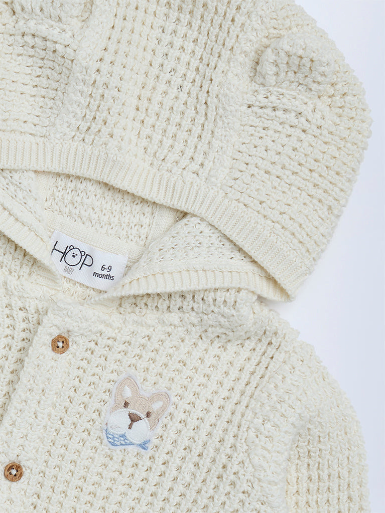 HOP Baby Girls Cream Knit-Textured Hooded Cotton Sweater