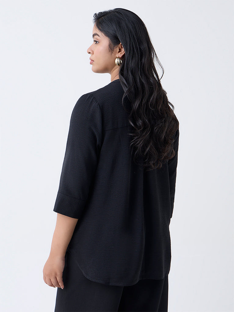 Gia introduces this black shirt patterned with polka dot motifs. Crafted from a breathable fabric, it features a clean collar and a neat quarter button placket finished with a concealed closure for a smooth, polished look. Three-quarter sleeves offer an effortlessly balanced silhouette—perfect for work, weekends, or anywhere in between.