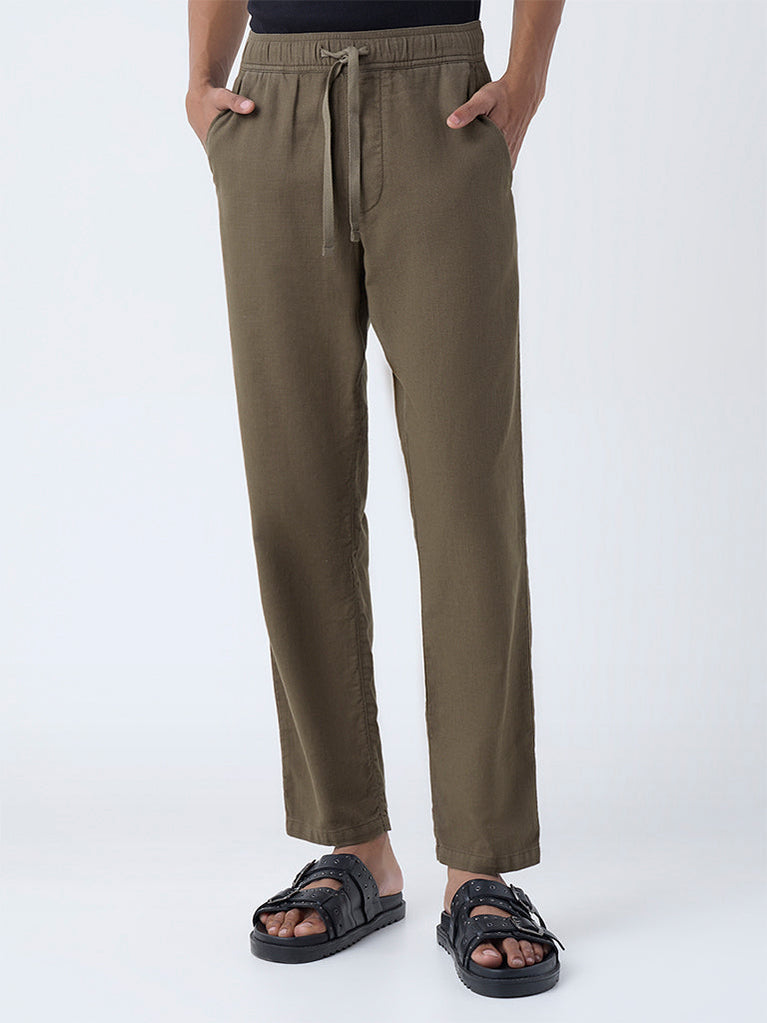 These olive pinstriped cotton pants from ETA combine laid-back comfort with subtle sophistication. Designed in a relaxed mid-rise silhouette, they feature a smooth elastic waistband with adjustable drawstrings and multiple pockets—perfect for effortless, everyday wear.