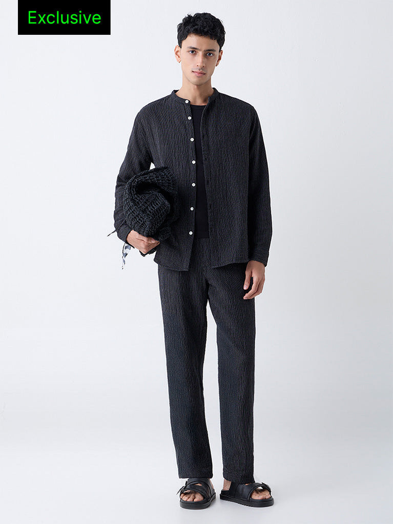 Effortlessly blending comfort with refinement, these black pinstriped cotton pants from ETA feature a relaxed-fit silhouette and a mid-rise waist. The smooth elastic waistband with adjustable drawstrings ensures ease of wear, while multiple pockets add practical versatility for everyday dressing.
