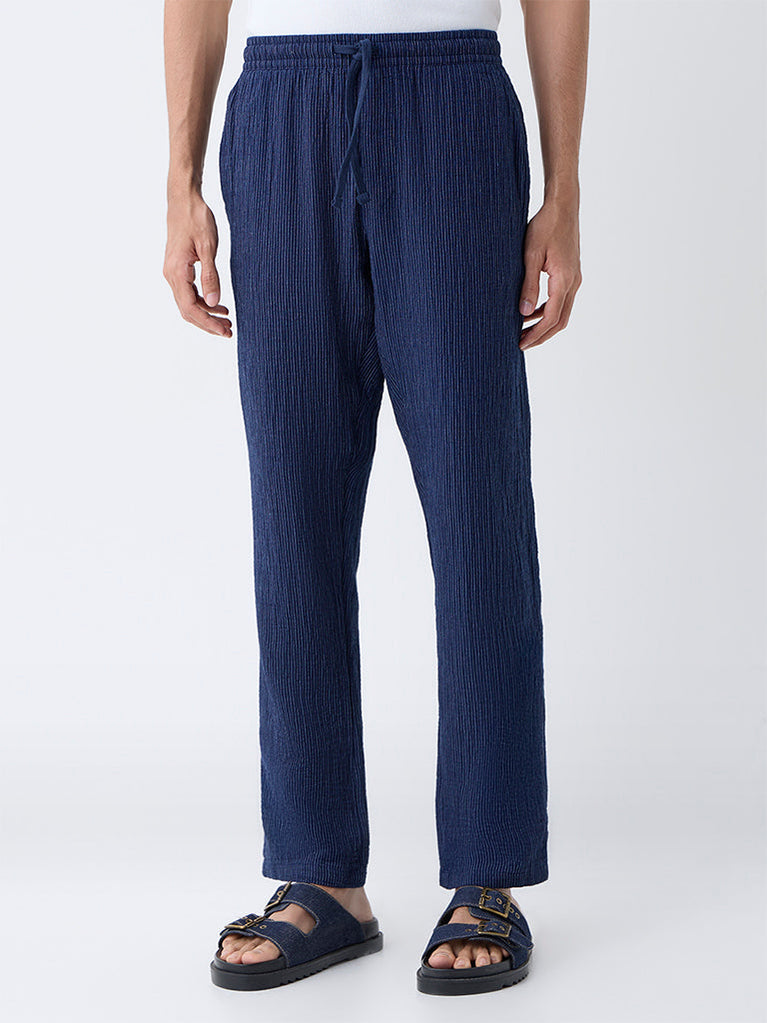 ETA launches these navy pinstriped cotton pants, designed to redefine everyday comfort with a refined touch. Crafted from soft cotton in a relaxed mid-rise fit, they feature a smooth elastic waistband with adjustable drawstrings and multiple pockets, making them a versatile essential for modern dressing.