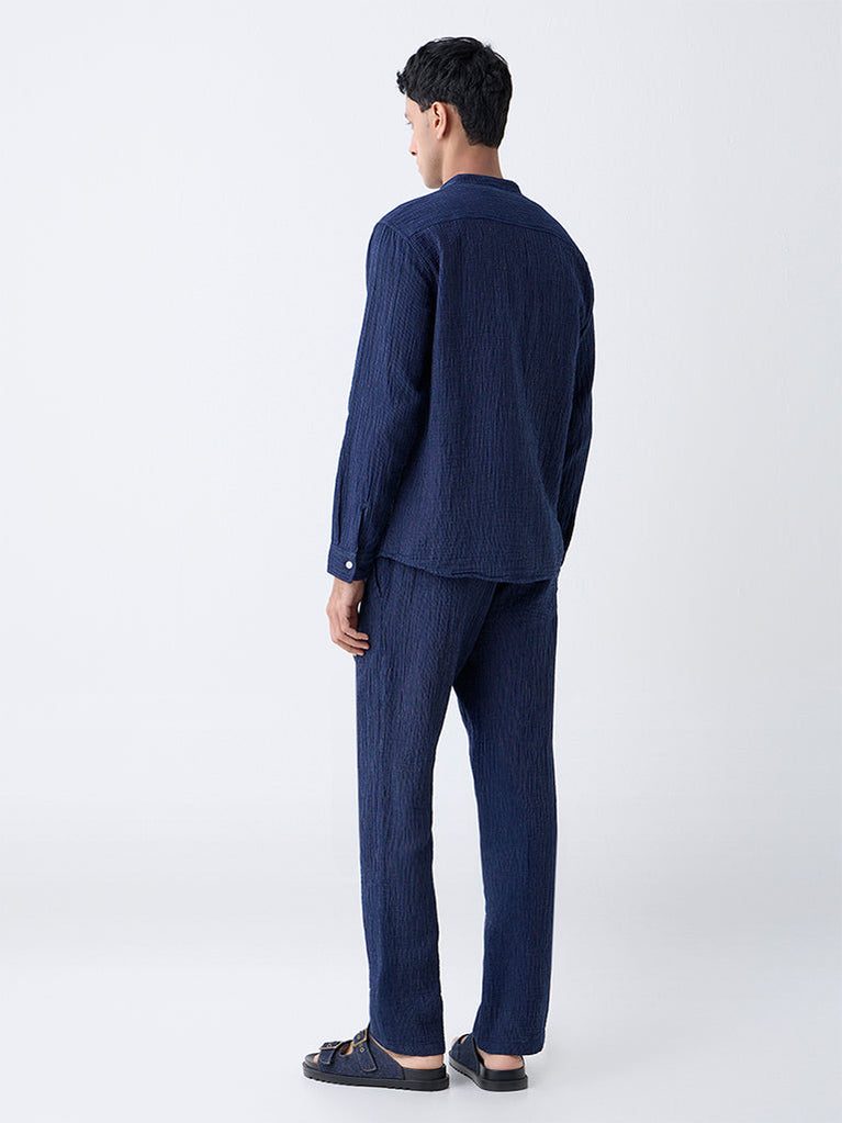 Smart, effortless, and versatile, this indigo striped shirt from ETA is crafted from breathable cotton for all-day comfort. The relaxed fit, band collar, button-down front, and full sleeves give it a refined yet easy-going edge. Ideal for pairing with chinos or denim, it’s a go-to off-duty staple for casual city style.