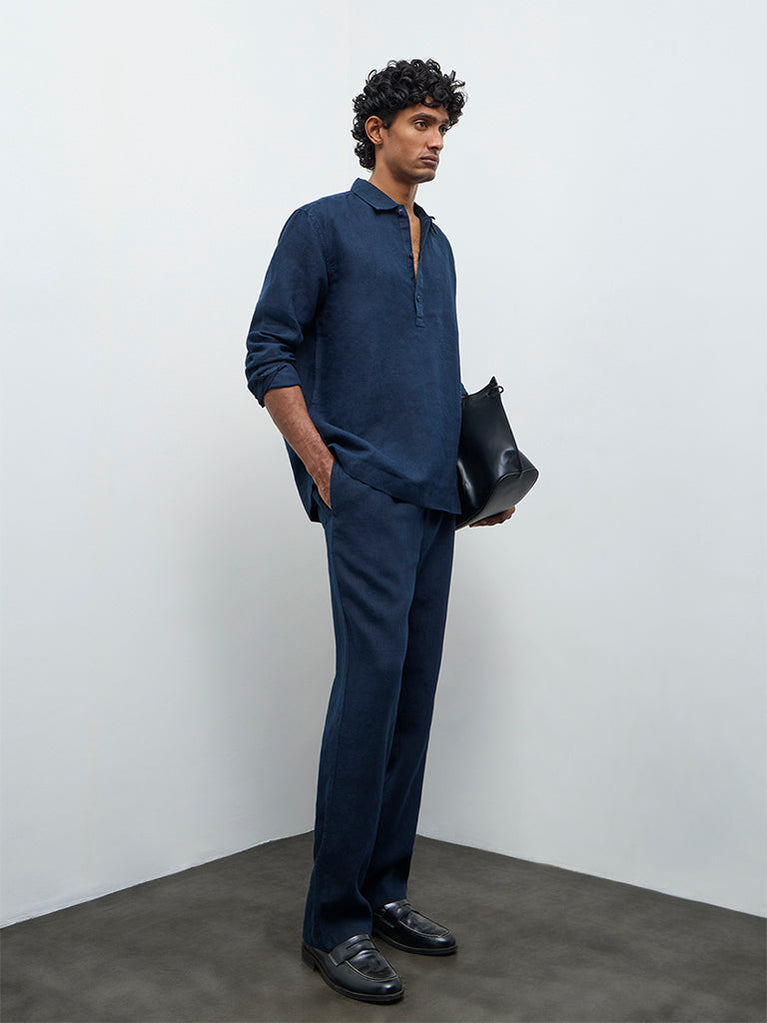Ascot introduces these indigo chinos crafted from a sumptuous linen fabric and shaped in a relaxed fit for effortless wear. Designed in a mid-rise waist, they feature an elasticated waistband with adjustable drawstrings for comfort. Multiple pockets add everyday practicality, making them suitable for workdays and more formal settings.