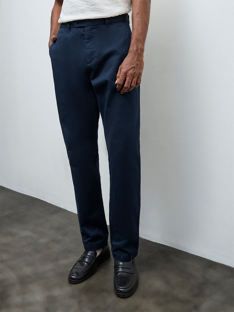 These navy trousers from Ascot are designed in a relaxed frame with a mid-rise profile. They feature a buttoned waist, zipper fly, belt loops, and a classic five-pocket construction for everyday functionality. Milled from a breathable fabric, they offer a comfortable feel with a clean finish suited to regular wear.