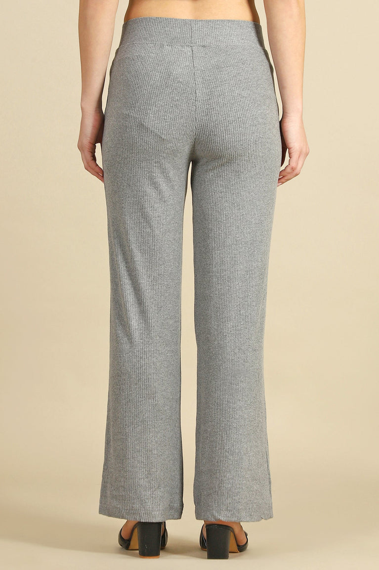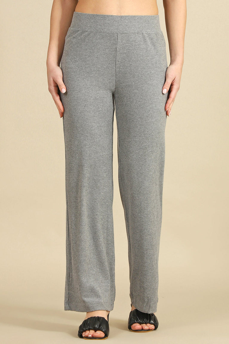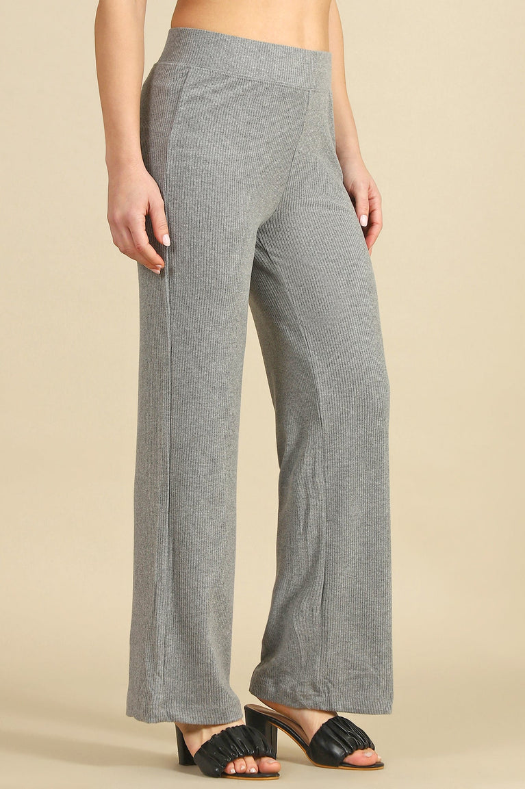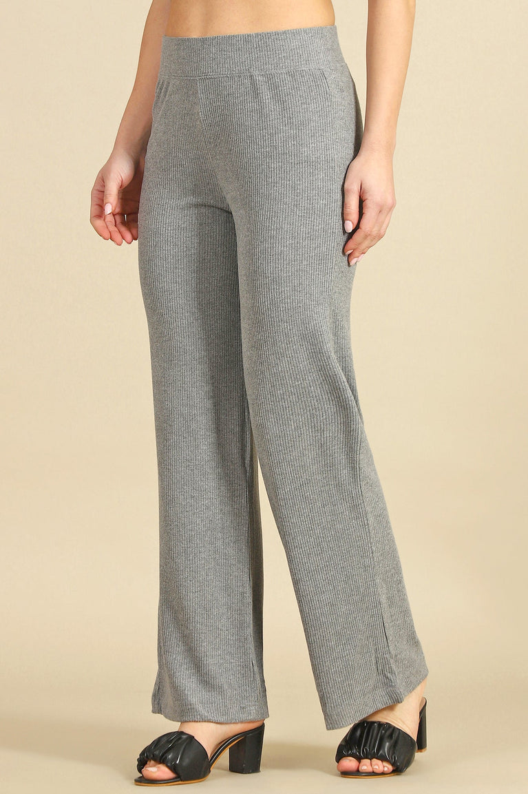 Crafted for effortless style and comfort, these grey solid knit pants are a wardrobe essential for casual outings. The straight-fit silhouette offers a flattering drape, while the slip-on closure ensures ease of wear. Made from a luxurious blend of rayon and spandex, these pants provide a soft, breathable feel with a touch of stretch for all-day comfort. The ribbed texture adds a subtle design element, making them versatile for pairing with fitted tops or oversized sweaters. Perfect for coffee dates, errands, or relaxed evenings, these pants are your go-to choice for chic, laid-back dressing.