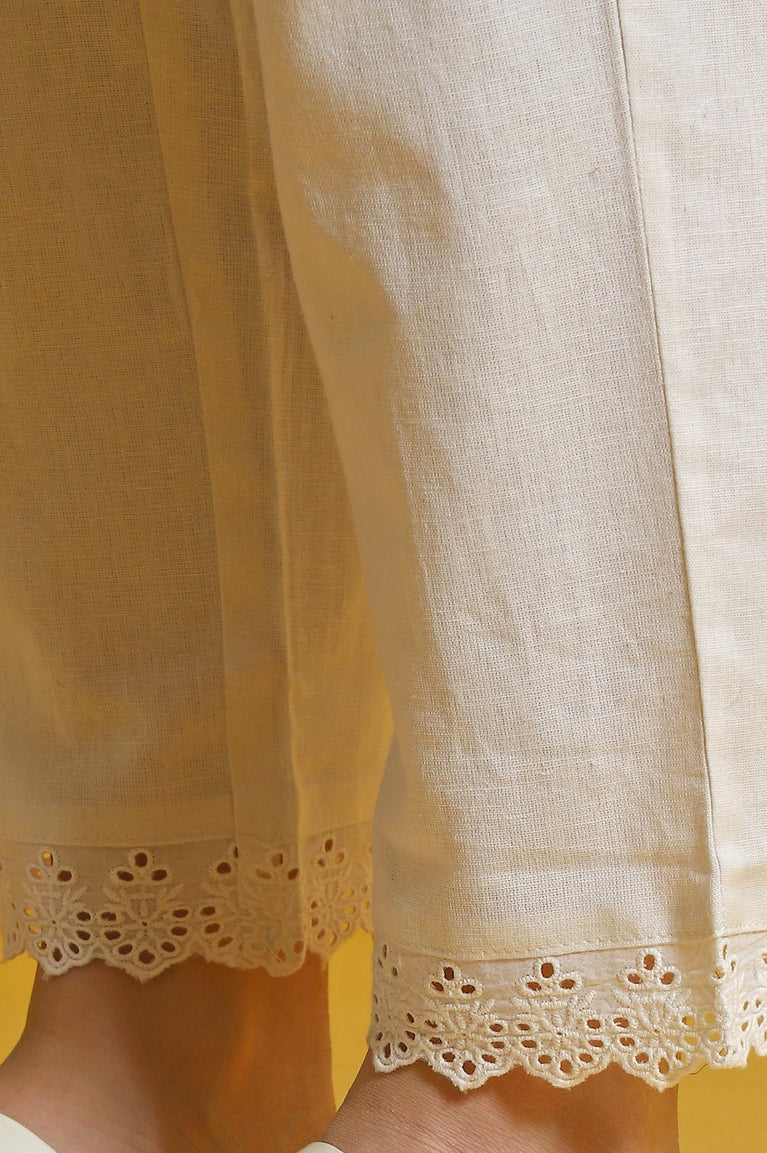 Add a touch of sophistication to your wardrobe with the W for Woman Solid Lace Cotton Blend Straight Pants. Crafted from a premium cotton blend, these pants feature delicate lace detailing, elevating their look with a refined charm. The straight-cut design provides a comfortable fit, making them perfect for both formal and semi-casual occasions. Pair them with your favorite tops or kurtas for a stylish ensemble that blends elegance and versatility seamlessly.