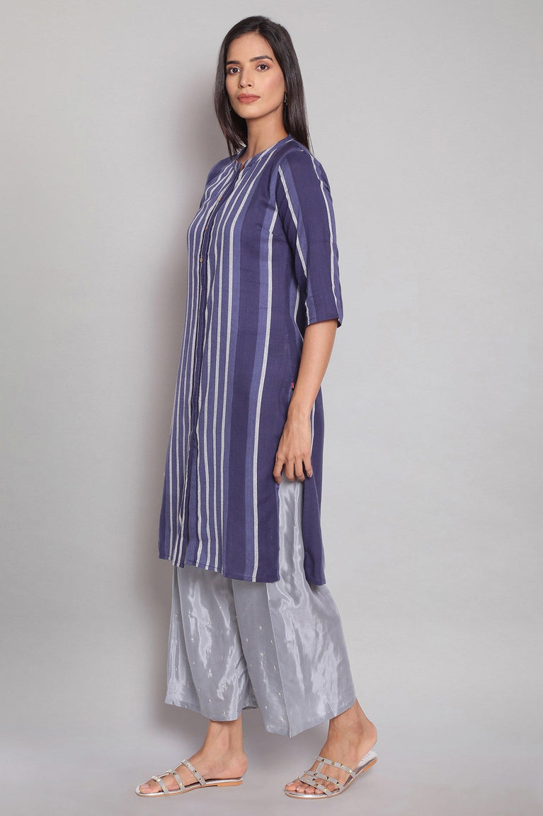 Amp Up Your Casual Wardrobe With This Yarn-Dyed Blue Stripes kurta. Designed In Straight Silhouette The kurta Has Mandarin Collar And Three-Quarter Sleeves.