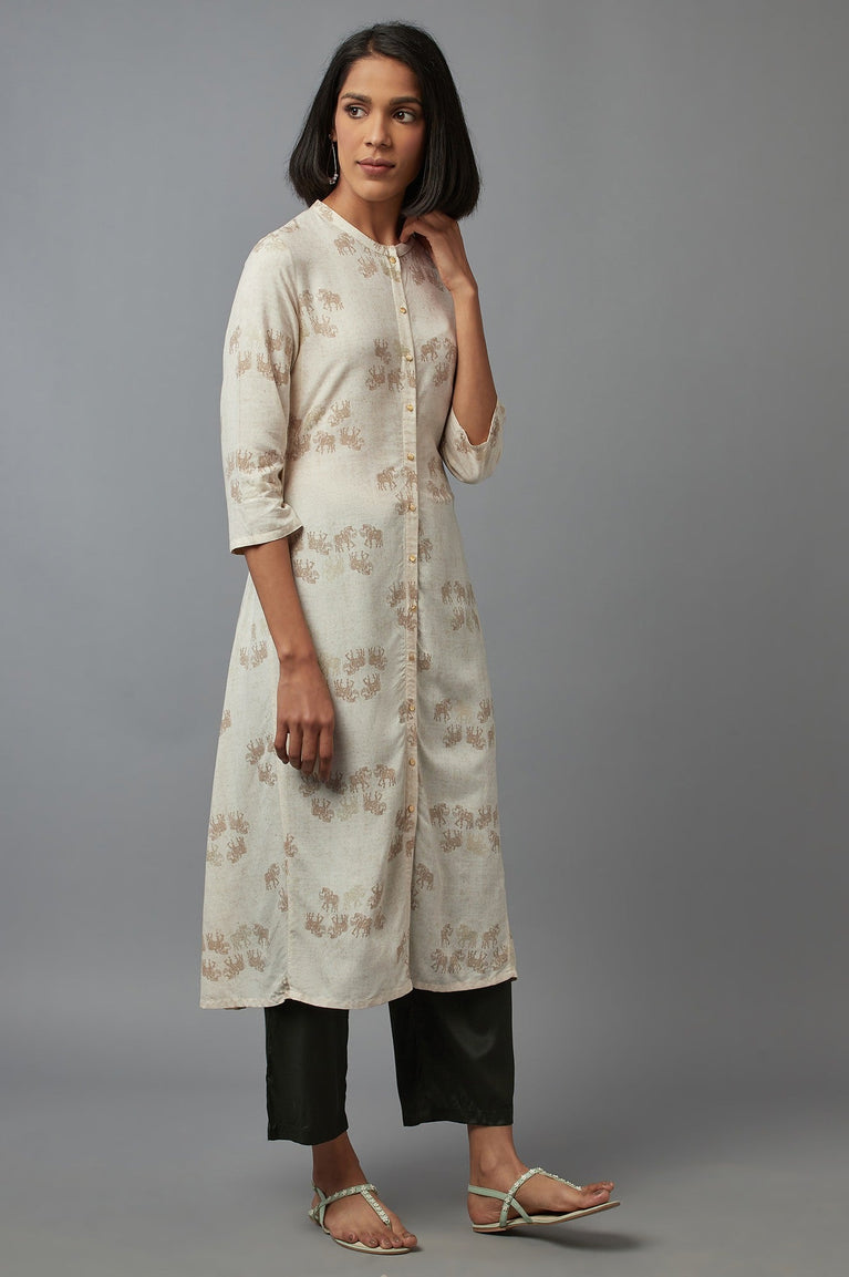Beige Floral Print Lace Trim A-Line Modal Kurta