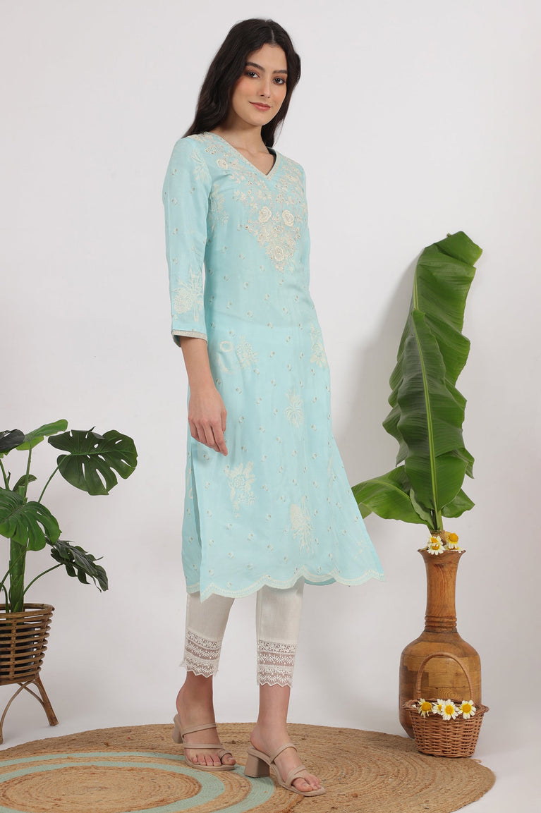 Add a touch of elegance to your everyday wardrobe with this blue casual kurta. Crafted from breathable and lightweight pure cotton, this kurta features a serene blue base adorned with delicate floral prints, offering a fresh and feminine appeal. The straight silhouette ensures a flattering fit, while the lace detailing on the neckline and sleeves adds a charming, handcrafted touch. Ideal for daily wear, casual outings, or office looks, this kurta pairs beautifully with both jeans and ethnic bottoms. Stay cool, stylish, and comfortable all day in this versatile wardrobe staple.