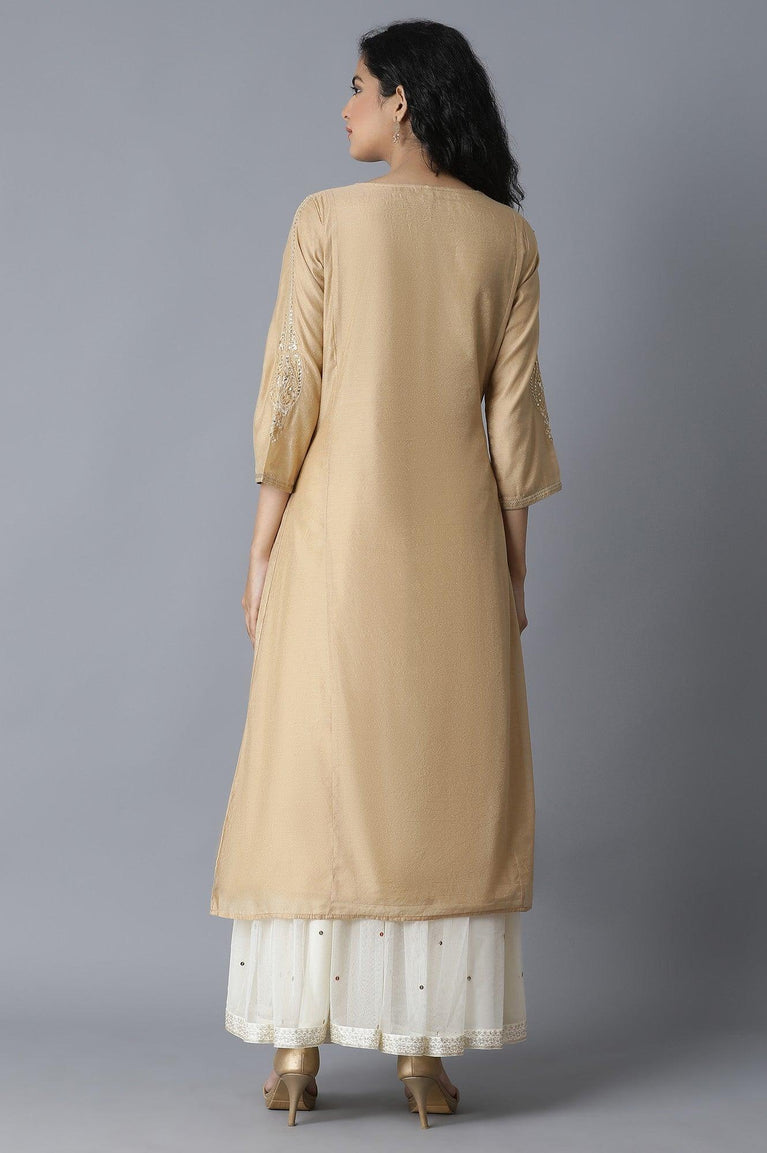 New beige panelled chanderi kurta with embroidered sleeves and round neck.