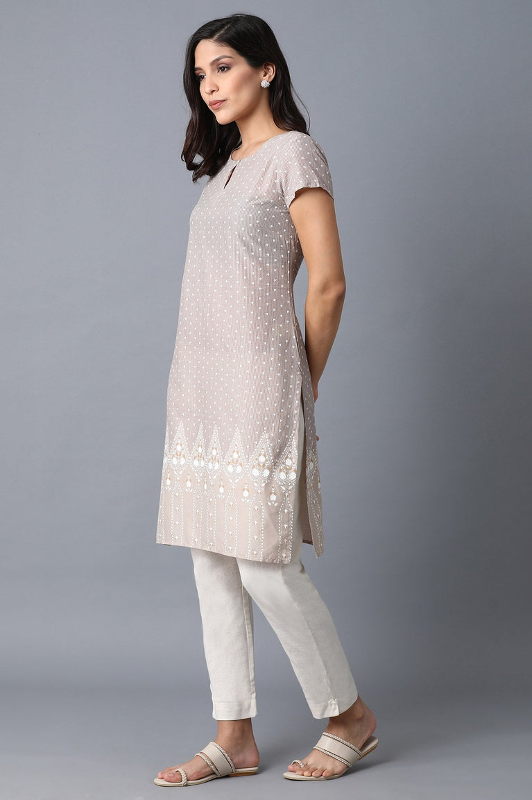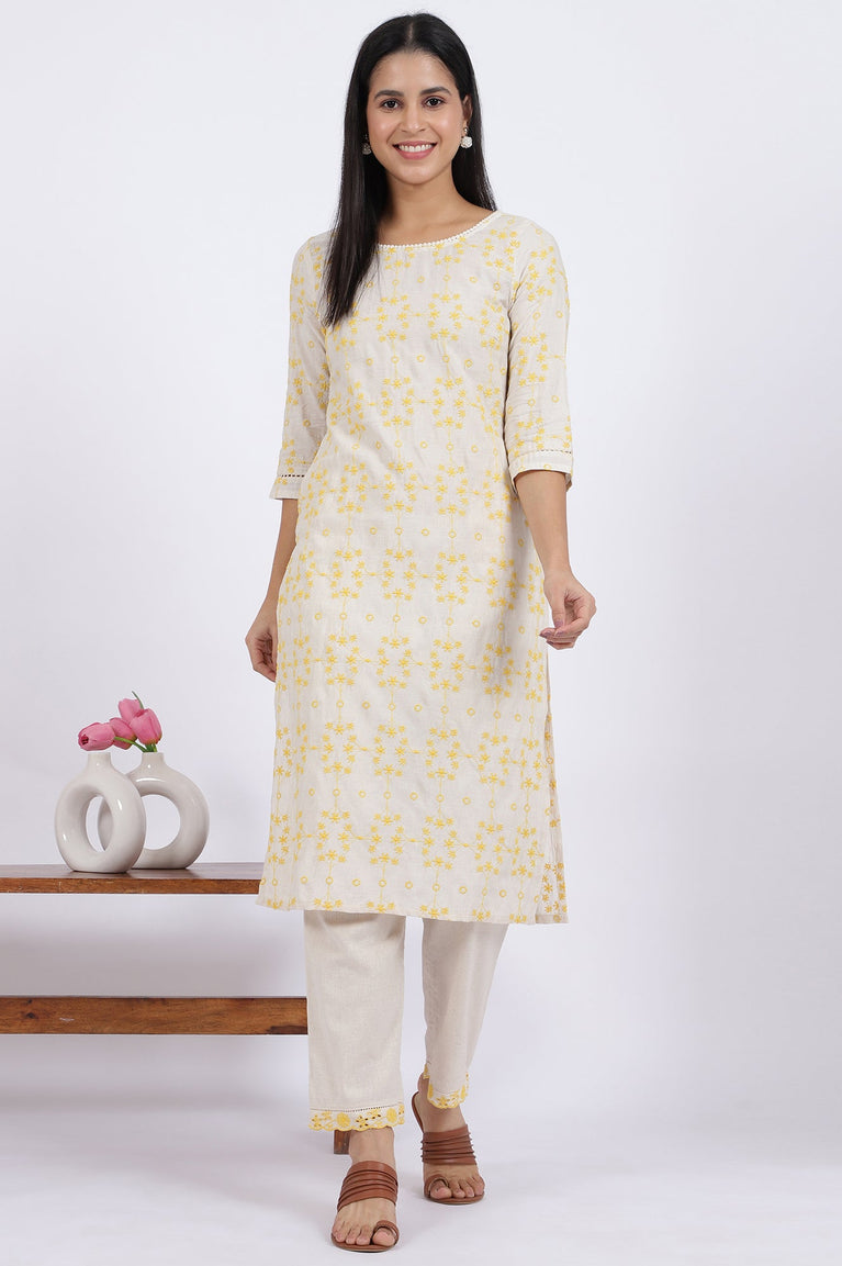 Beige Schiffli Embroidered Straight Rayon Flax Kurta
