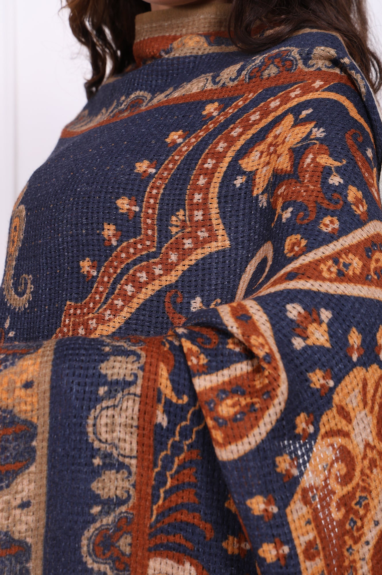 Wrap yourself in timeless elegance with this navy paisley printed wool shawl. The intricate paisley patterns, woven into a luxurious wool blend, create a stunning visual appeal. Measuring 2 meters in length and 70 cm in width, this shawl drapes beautifully, offering both warmth and style. Perfect for winter outings, it pairs effortlessly with ethnic or casual ensembles. The rich navy hue and detailed design make it a versatile accessory for any occasion, from festive gatherings to cozy evenings. Its soft texture and durable weave ensure comfort and longevity, while the all-over paisley print adds a touch of sophistication. Elevate your winter wardrobe with this designer shawl that combines tradition and modernity seamlessly.