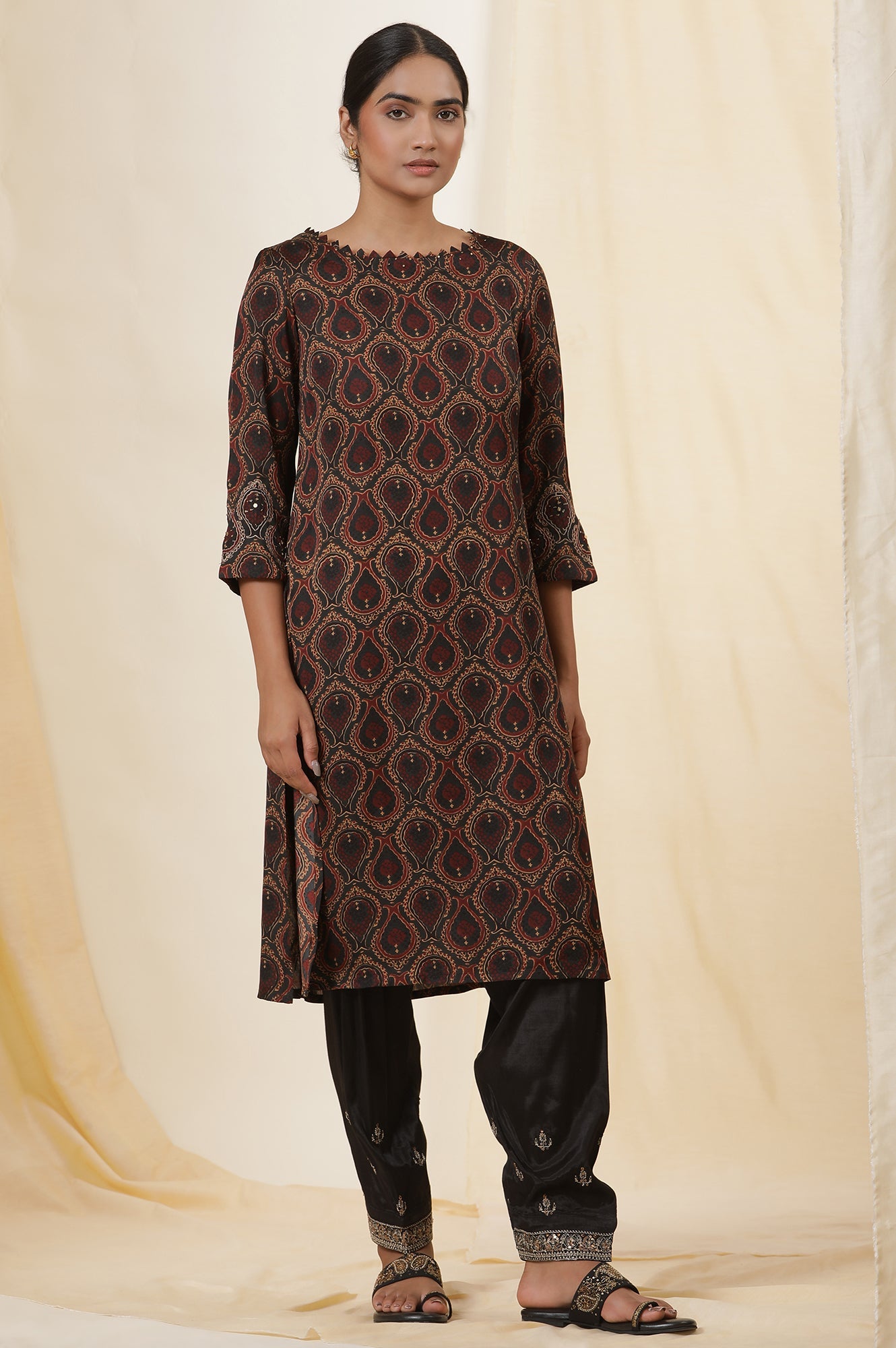 Discover the perfect blend of comfort and style with this exquisite woven kurta designed for the modern woman. Crafted from 100% viscose, this ethnic piece boasts a round neckline and three-quarter sleeves, making it ideal for casual occasions. The striking geometric print adds a contemporary touch to this straight-cut kurta, while the modal satin fabric ensures a luxurious feel against your skin. Available in a sophisticated black hue, this versatile garment effortlessly combines traditional elements with modern aesthetics, making it a must-have addition to your wardrobe. Pair it with stylish sandals to complete the look, exuding effortless elegance. Versatile and timeless, this outfit is perfect for making a statement at any occasion, day or night.