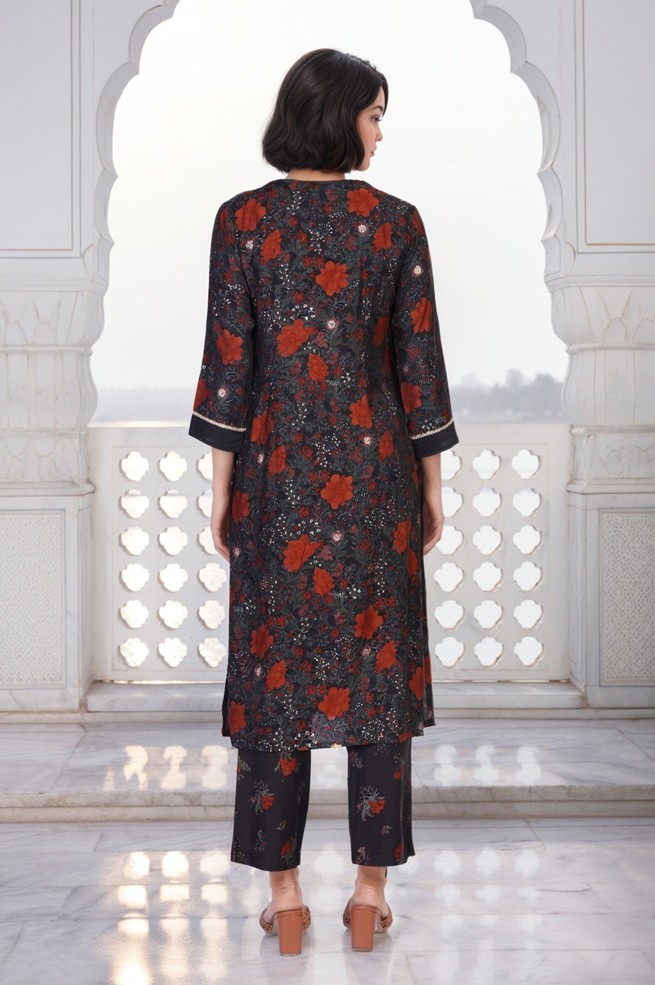 A timeless blend of elegance and charm, this black floral embroidered kurta is crafted from premium Vicuna Crape. The straight silhouette, adorned with intricate thread work, features a flattering V-neckline and three-quarter sleeves. Perfect for festive occasions, its all-over floral design adds a touch of sophistication. Pair it with statement jewelry and heels for an effortlessly chic look.