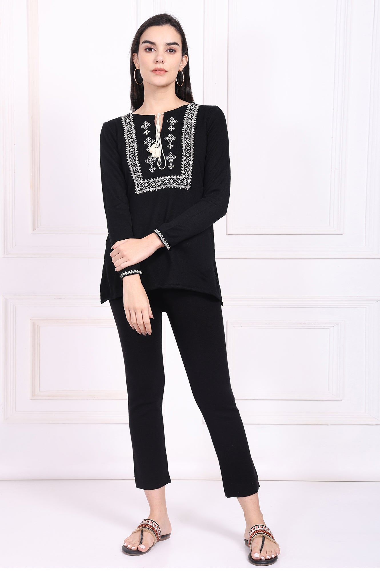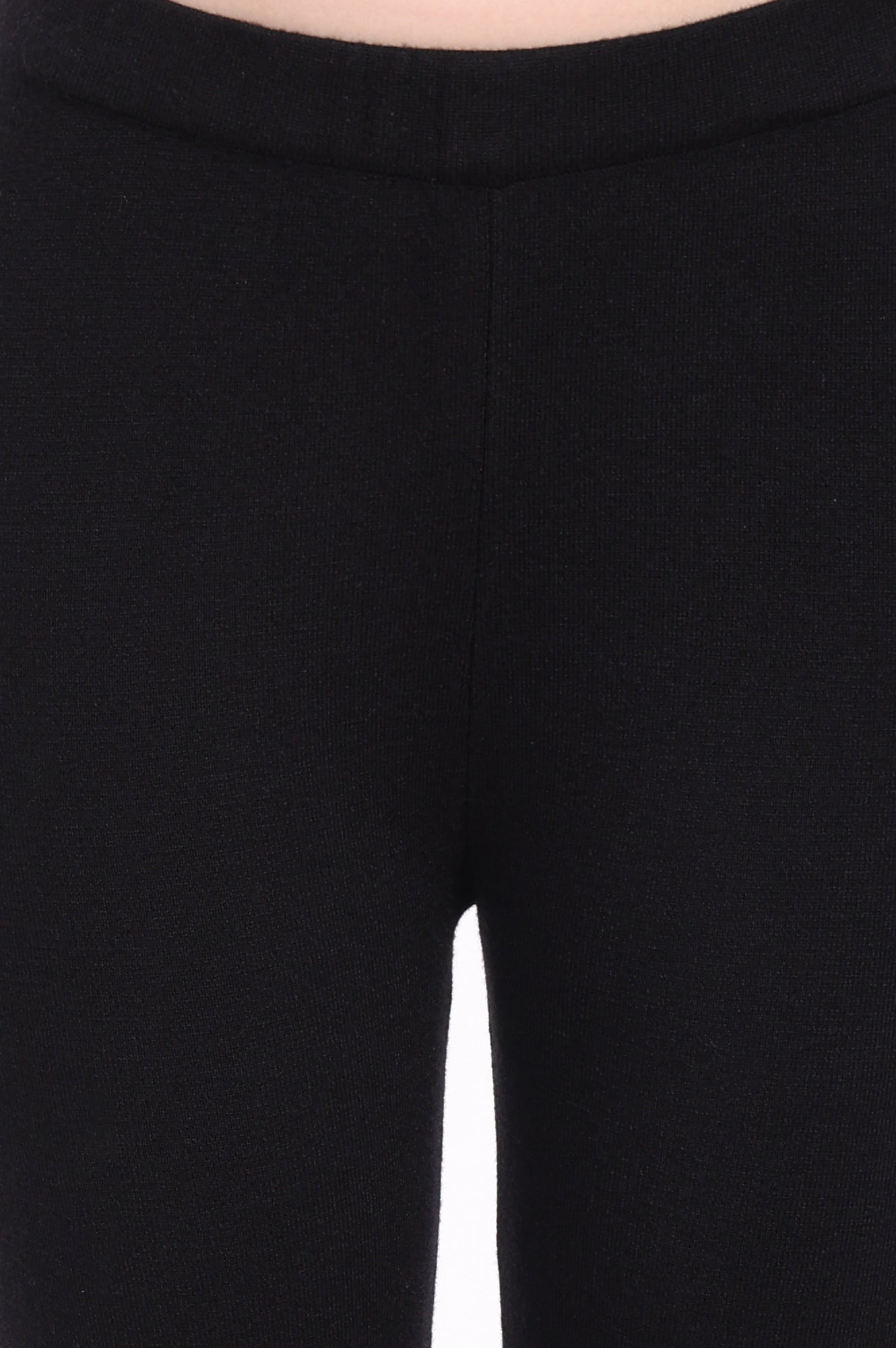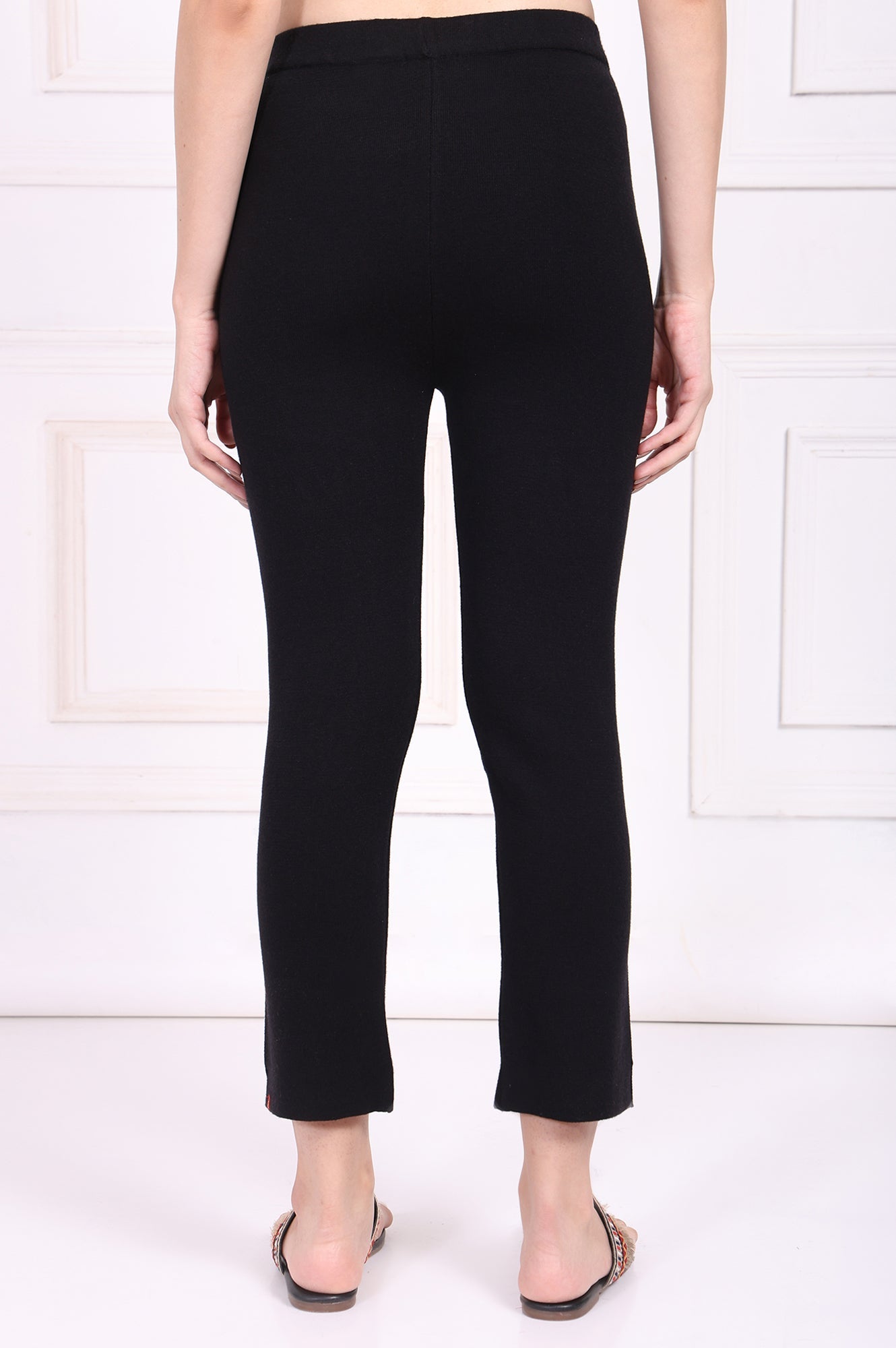 A masterpiece of minimalist design, these trousers for women are the answer to a flawlessly versatile wardrobe. Crafted to move with you, their design prioritizes both comfort and a polished aesthetic. As essential women's pants, they form the perfect canvas for weekday meetings or weekend brunches. The silhouette begins with a comfortable mid-rise, leading into a clean, flat front that ensures a smooth profile under any top. You’ll appreciate the ease of the fully elasticated waistband, making these black knit straight-leg pants a simple pull-on style without any fussy closures. The fit is impeccably tailored—a slim straight-leg cut that skims the body gracefully without feeling restrictive, offering a modern and elongated look. For an uncluttered finish, they are designed without any pockets. These ankle-length pants with slit detailing at the hem add a final touch of contemporary flair, allowing for beautiful movement and a peek of your favorite footwear. Woven from a fabric with a soft-to-the-touch feel and inherent flexibility, these ladies' trousers promise to be your most-worn pair, blending sophisticated structure with the ease of your favorite loungewear. They are the ultimate staple in refined, everyday dressing.