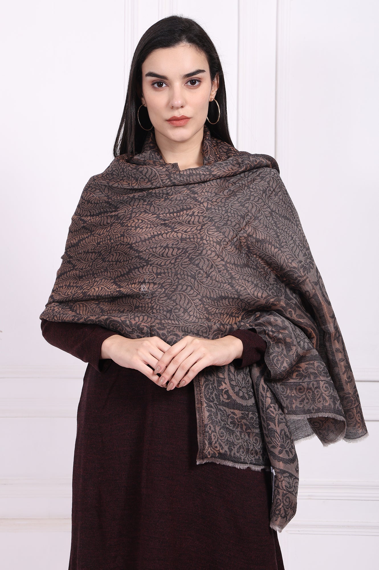 A whisper of heritage for the modern muse, this exquisite shawl for women is a masterpiece of classic textile art. It's the kind of piece you'll reach for when you want to add a layer of quiet sophistication. Intricately woven from a warm, soft wool-blend fabric, it feels wonderfully luxurious against the skin, promising comfort on cooler days. The stunning design showcases a timeless, all-over paisley pattern in sophisticated shades of Earthen Brown and Charcoal, a beautiful result of its traditional yarn-dyed creation. This beautiful ethnic stole is further enhanced with subtle metallic fibres woven throughout the fabric, which catch the light with a gentle, understated shimmer that lends it an air of quiet opulence. Measuring a generous 2.1 metres in length and 75cm in width, this designer wrap offers endless versatile styling options—drape it elegantly over the shoulders or loop it for a cozier feel. Its completely opaque fabric provides modest and graceful coverage, while the edges are perfectly finished with a delicate, short fringe, adding a touch of classic texture. Ideal for festive gatherings, formal events, or simply elevating your everyday winter style, this elegant ethnic wrap for women is a truly timeless addition to your accessory collection.