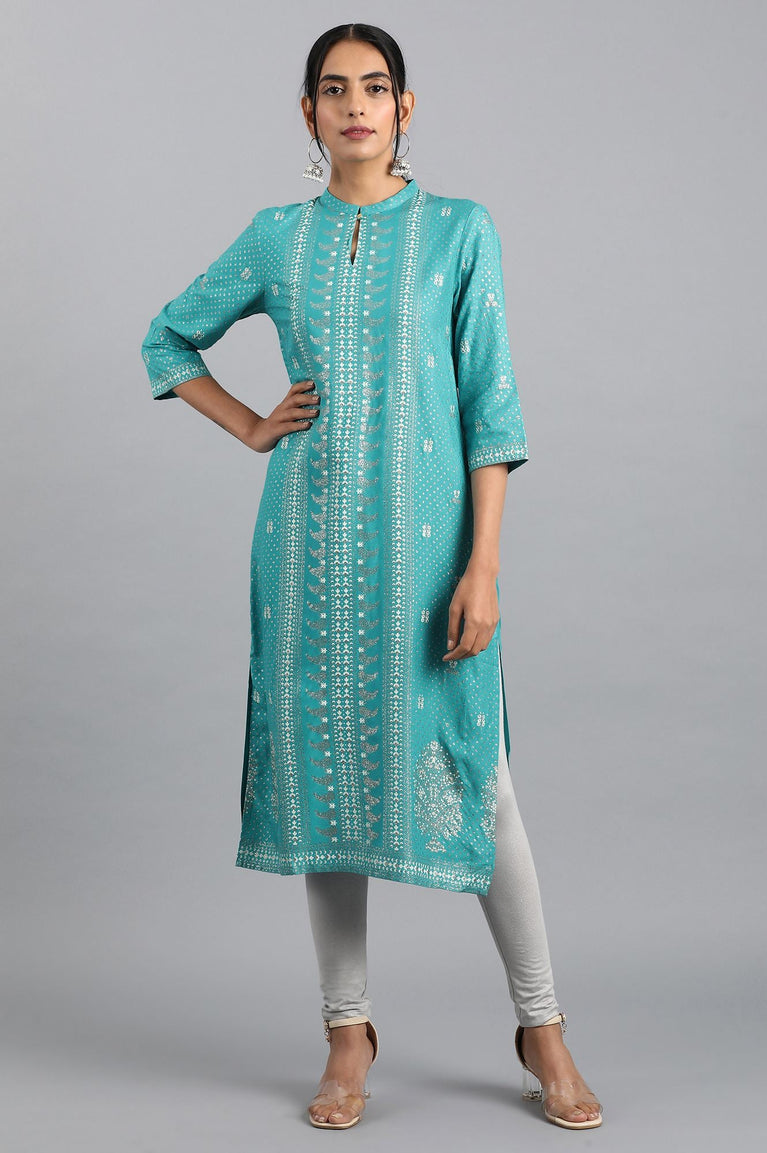 Elevate your ethnic wardrobe with this stunning women's kurta. Crafted from 100% rayon, this a-line kurta features an eye-catching geometric print that adds a modern twist to traditional design. The round neckline and three-quarter sleeves offer a perfect balance of style and comfort. Ideal for casual occasions, this woven blue kurta embodies the essence of ethnic fashion. Its versatile design makes it a must-have addition to any wardrobe, seamlessly blending contemporary aesthetics with timeless charm. Pair it with stylish sandals to complete the look, exuding effortless elegance. Versatile and timeless, this outfit is perfect for making a statement at any occasion, day or night.