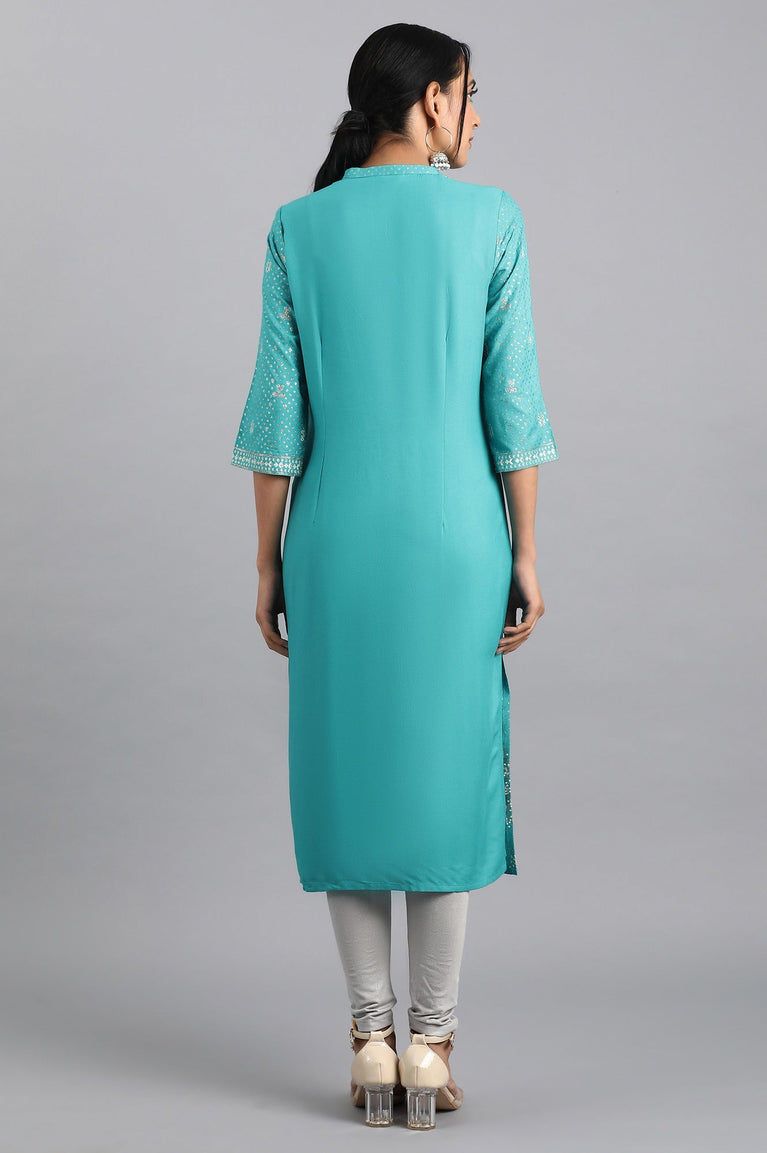Steal the spotlight on you by wearing this pretty blue straight kurta. Crafted in premium fabric, the kurta is adorned with floral glitter print all over and has keyhole neckline