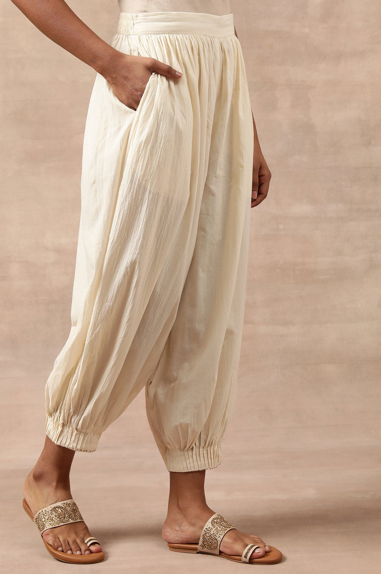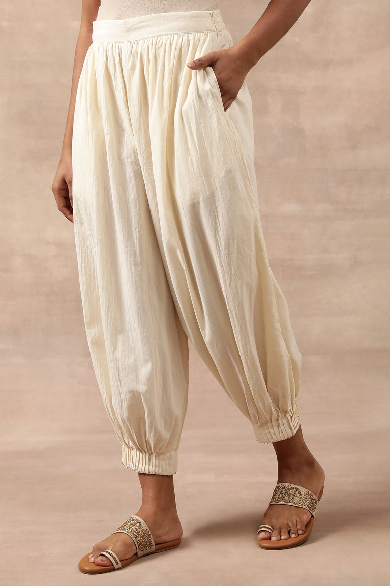 Softly tailored for effortless charm, these salwar pants for women feature a pleated hem design in Ecru. Crafted from breathable voile cotton, the relaxed fit ensures comfort while the mid-rise waistband adds a touch of elegance. Side slit pockets offer practicality, and the beaded ornamentation enhances the ethnic fusion appeal. Perfect for pairing with block-printed kurtas or cotton silk drapes, these salwar pants are a versatile addition to your wardrobe.