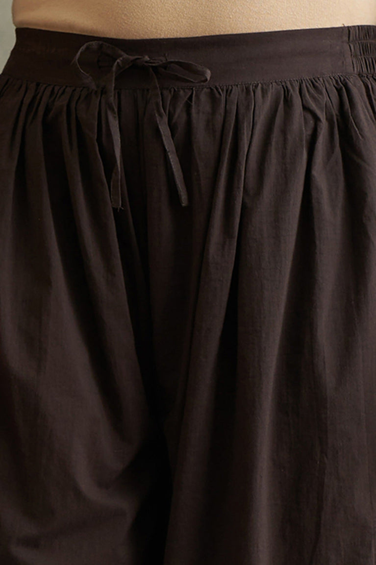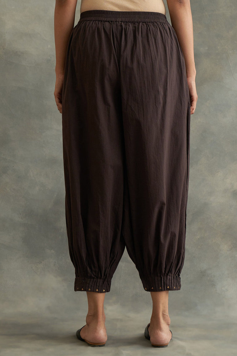Softly tailored for effortless charm, these dark brown salwar pants are a versatile addition to your wardrobe. Designed with a pleated hem adorned with subtle sequin work, these trousers exude understated elegance. The elasticated waistband ensures a comfortable fit, while the side pockets add practicality. Crafted from 100% cotton, the woven fabric offers a breathable and lightweight feel, perfect for casual outings or festive gatherings. The tapered leg style and calf-length cut make these pants a stylish choice for pairing with block-printed kurtas or matching drapes. Elevate your ethnic fusion look with these relaxed-fit salwar pants.