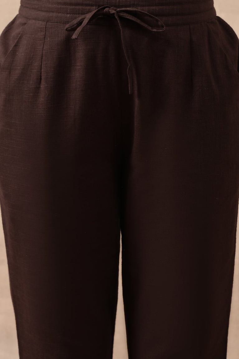 Tailored for effortless charm! These women’s trousers sculpt a sleek mid-rise profile in Coffee Bean, accentuated by a straight-leg silhouette. A drawstring closure keeps the waistline comfortable, while slant pockets lend practicality. Embroidered detailing traces the hem, ending at an ankle-length finish that exudes understated elegance. Crafted from a cotton-flax blend, this pair is perfect for casual outings or ethnic occasions. Pair it with an indigo block-printed kurta for a complete look.