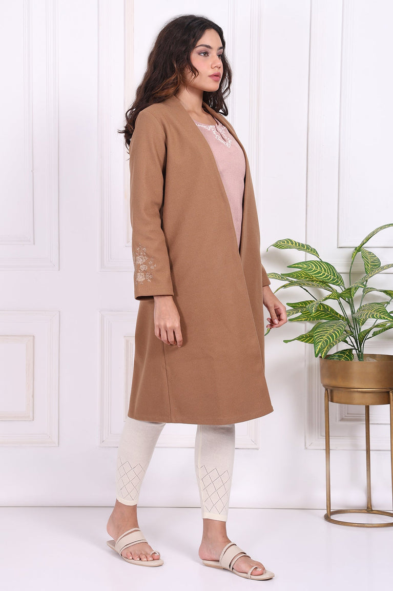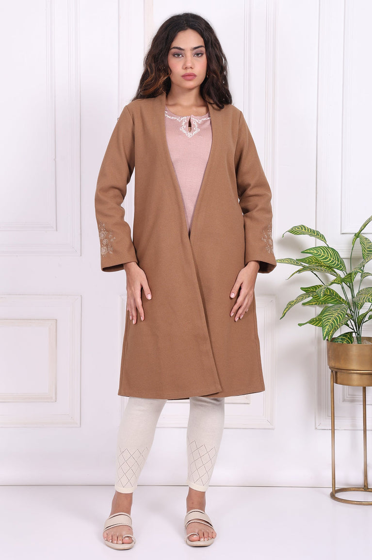 Step into the season with this elegant camel brown straight coat for women. Featuring an open front design and delicate embroidered sleeves, this coat is crafted from woven fabric for warmth and durability. Its straight silhouette and medium brown shade make it a versatile addition to your wardrobe, perfect for both casual outings and formal gatherings. Pair it with leggings or trousers for a chic and cozy look this winter.