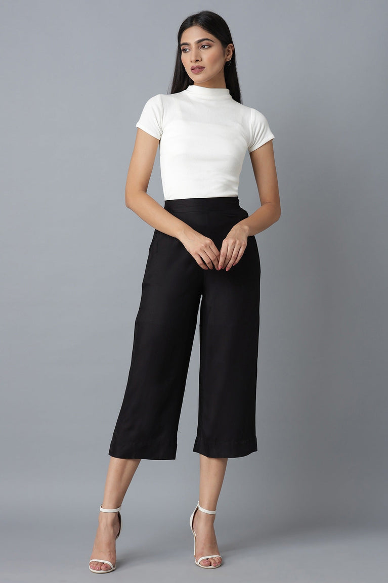Get a classy look in this calf length black culottes. It has midrise and partially elasticated waist that gives a perfect fit. The solid culottes also has 2-side pockets.