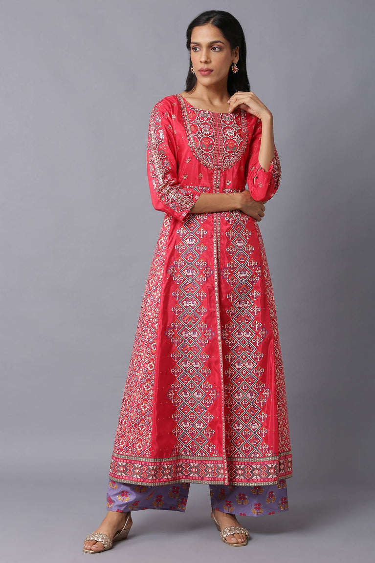 Style This Pretty Blue Front Open kurta And Slim Pants Set At Your Light Festive Event. This Brittany Blue kurta Is Adorned With Glitter Print And Has Bead Work. It Also Features Front Slit And Has Round Neck. Coordinated With Blue Floral Parallel Pants In Mid-Rise And Partially Elasticated Waistband.