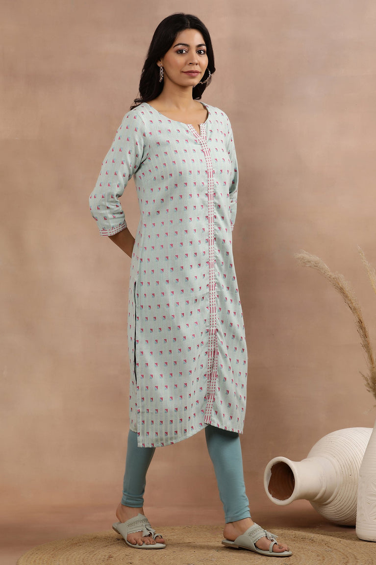 Discover the perfect blend of comfort and style with this ethnic-inspired straight kurta for women. Showcasing a sophisticated v-neck and three-quarter sleeves, this woven garment is ideal for casual outings. The striking blue hue is adorned with an eye-catching geometric print, adding a contemporary twist to traditional design. Crafted from a premium blend of 88% cotton and 12% flax, this kurta offers exceptional breathability and durability. The cotton flax fabric ensures a soft, comfortable feel while maintaining its shape throughout the day. Perfect for various casual occasions, this kurta combines timeless elegance with modern comfort. Its versatile design makes it easy to pair with a variety of bottoms and accessories, allowing you to create multiple stylish looks effortlessly.