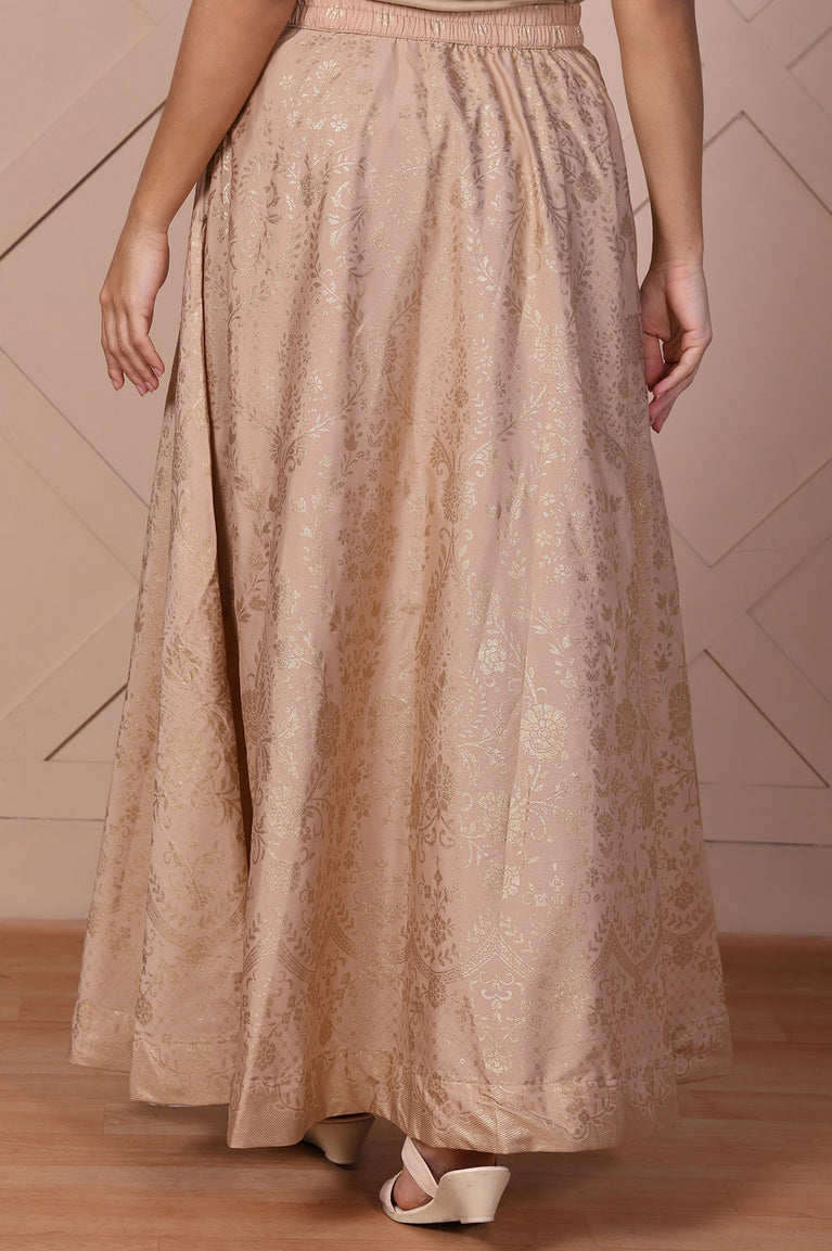 Softly sophisticated! This beige flared skirt for women showcases a stunning gold floral print that exudes ethnic charm. The elasticated waistband ensures comfort, while the flowing silhouette adds elegance to festive gatherings. Perfect for pairing with kurtas or tops, this versatile piece is a wardrobe essential.