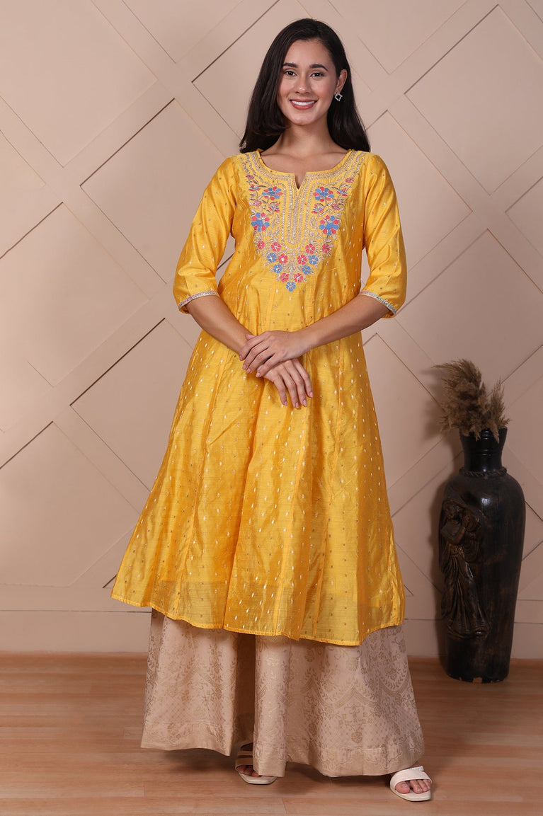 Beige Embroidered A-Line Chanderi Kurta with Straight Pant and Dupatta Set
