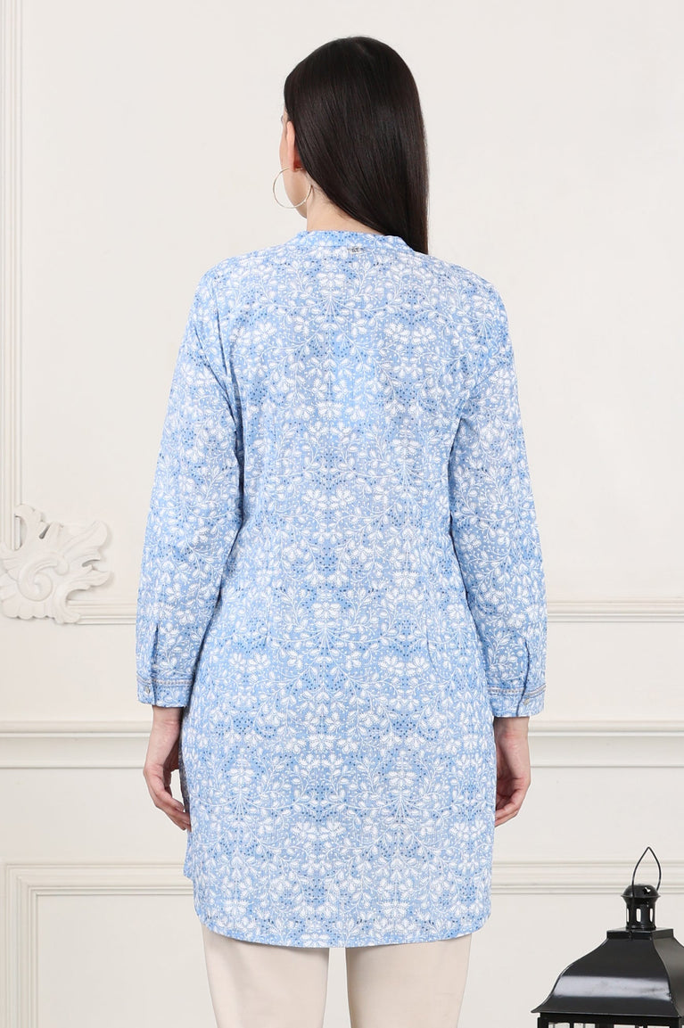 Blue Floral Printed Mandarin Collar Pure Cotton Tunic