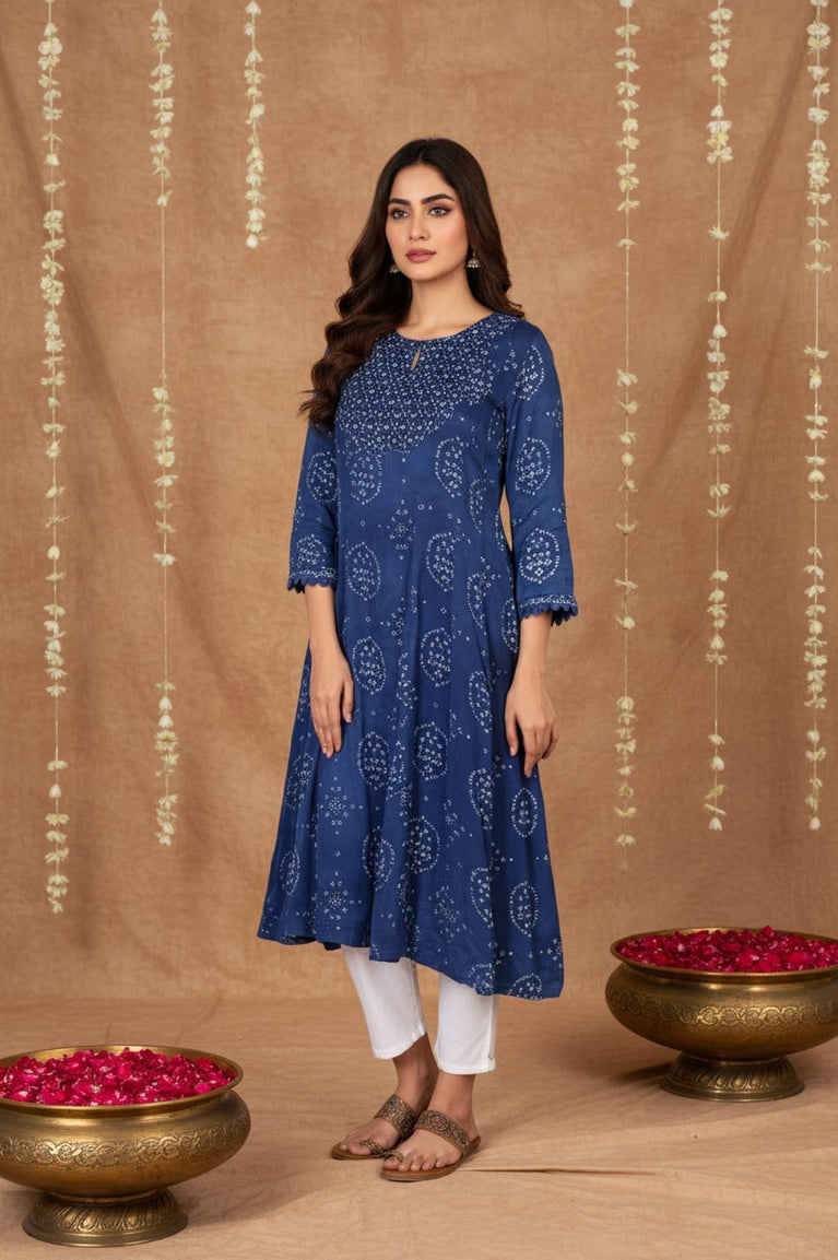 Blue Bandhani Mirror Work Flared Modal Satin Kurta