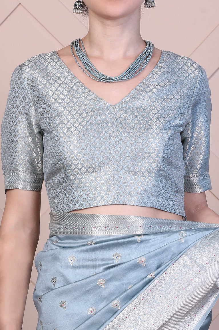 Blue Embellished Silk Jacquard Saree with Unstitched Blouse