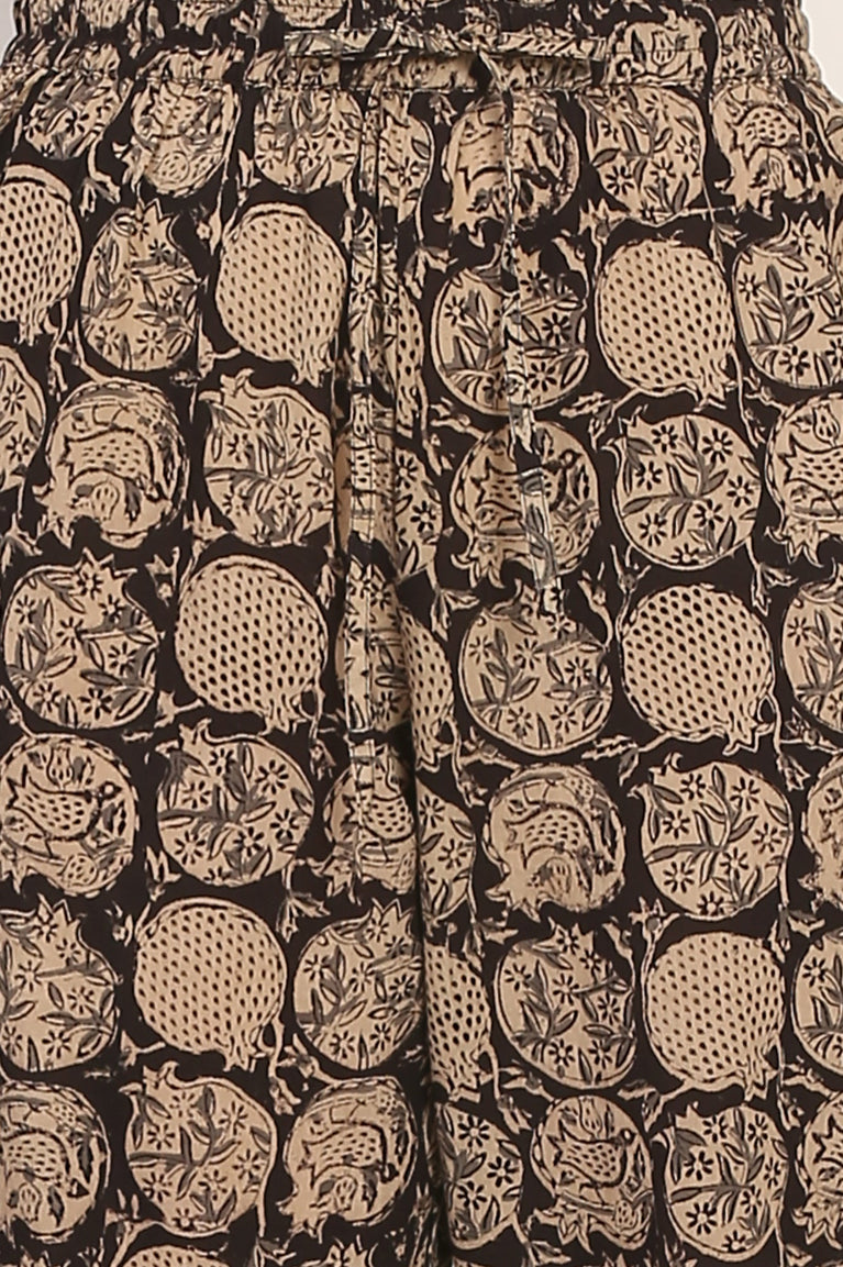 Elevate your casual wardrobe with this black kalamkari printed kurta co-ord set for women from Folksong, a harmonious blend of tradition and modernity. This set comprises a knee-length A-line kurta and mid-rise straight pants, both tailored from 100% pure cotton for breathable, all-day comfort. Designed with a round neckline, 3/4th regular sleeves, and adorned with delicate sequin detailing, the kurta offers a refined aesthetic. The black backdrop enhances the all-over floral print, making it a versatile piece for everyday ethnic wear. The pants come with a drawstring waistband for an adjustable fit. Crafted for Indian summers, this outfit ensures elegance without compromising on ease. Ideal for daytime gatherings, workwear, or casual outings, it’s a timeless addition to your ethnic closet.