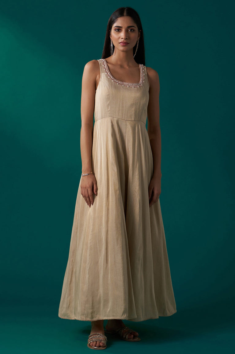 A whisper of elegance stitched into every seam, this beige sequin embroidered anarkali dress is a masterpiece of festive fashion. The scoop neckline and sleeveless bodice are paired with a sheer embroidered jacket, creating a layered look that swishes with grace. The churidar adds a touch of tradition while ensuring comfort. Perfect for evening celebrations, this ensemble is a blend of modern sophistication and ethnic charm. Dry clean recommended to preserve the intricate embroidery and delicate fabric.