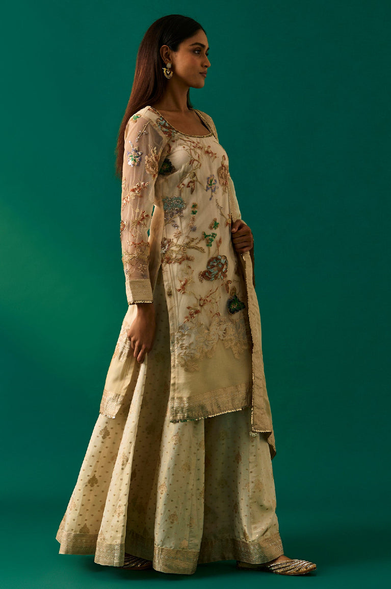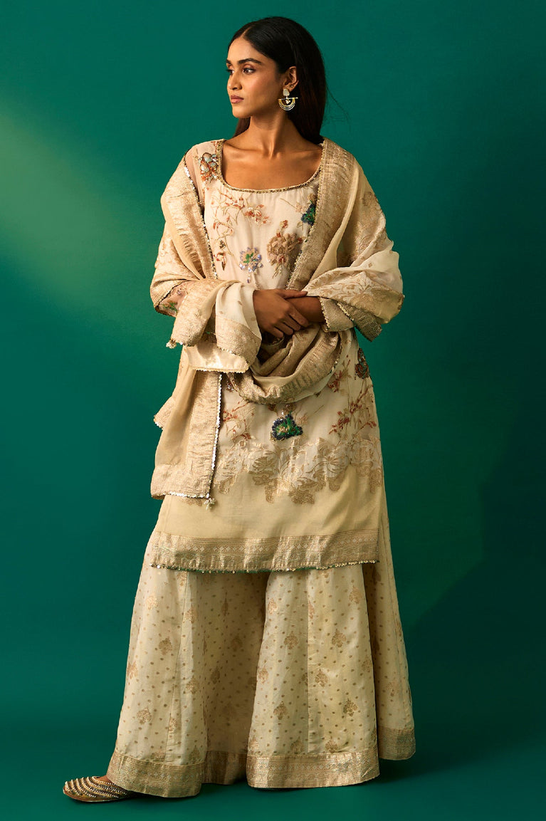 Beige Embroidered Straight Tissue Kurta with Sharara and Dupatta Set