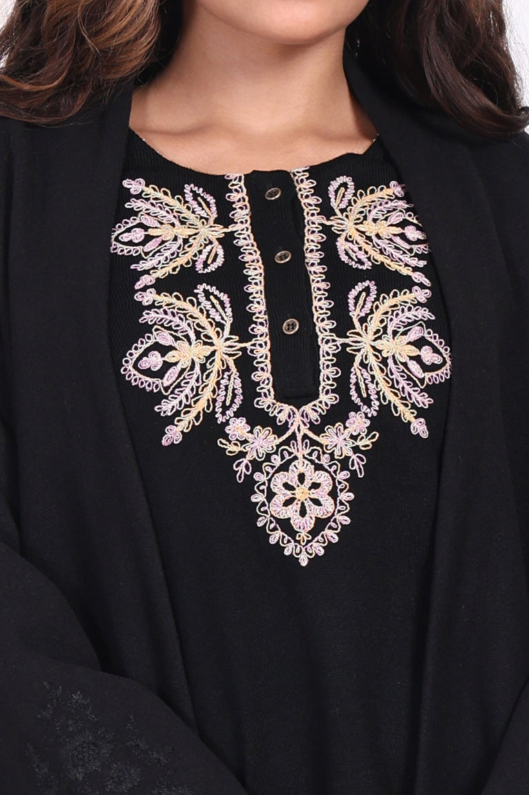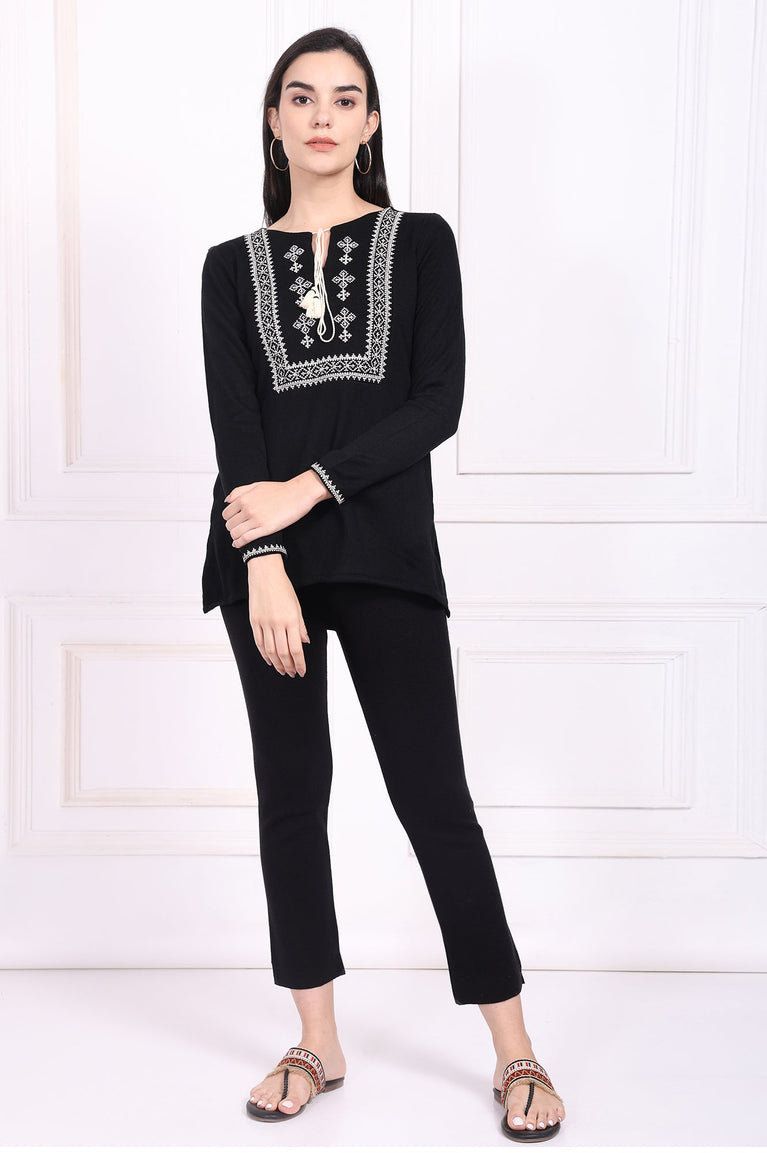 Refined and versatile, this black acrylic tunic for women is a wardrobe essential. Featuring intricate thread embroidery on the neckline and cuffs, this straight silhouette tunic with side slits offers a flattering fit. The soft acrylic fabric ensures comfort and warmth, making it perfect for casual outings or festive gatherings. Elevate your style with this elegant and versatile piece.