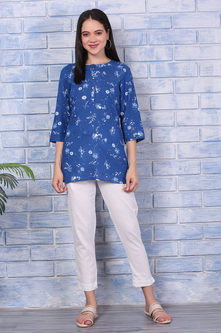 Add a touch of elegance to your everyday wardrobe with this modern printed top. Crafted from a breathable rayon flax blend, this top combines natural texture with a soft, flowy drape, perfect for all-day comfort. The soothing blue base is beautifully enhanced with floral prints, exuding charm and freshness. A standout feature is the delicate bead detailing on the neckline, adding subtle sparkle and elevating the overall look. Designed in a relaxed fit, this versatile top pairs effortlessly with denims, culottes, or straight pants — ideal for casual outings, office wear, or brunch with friends.