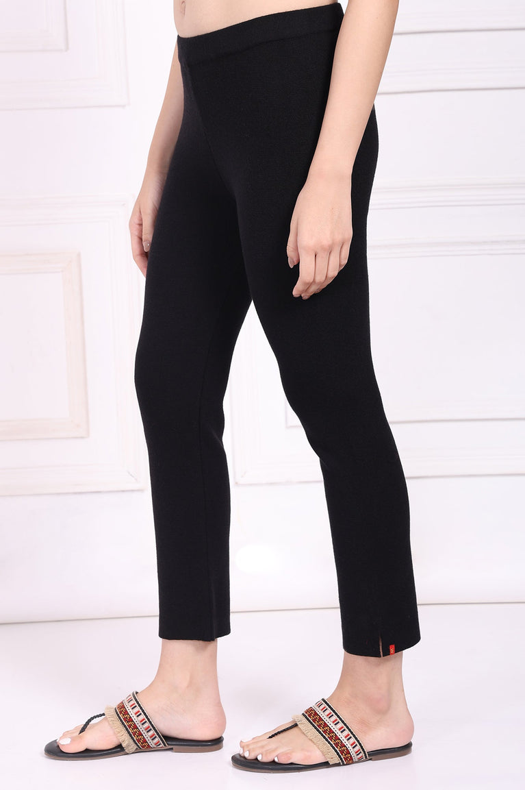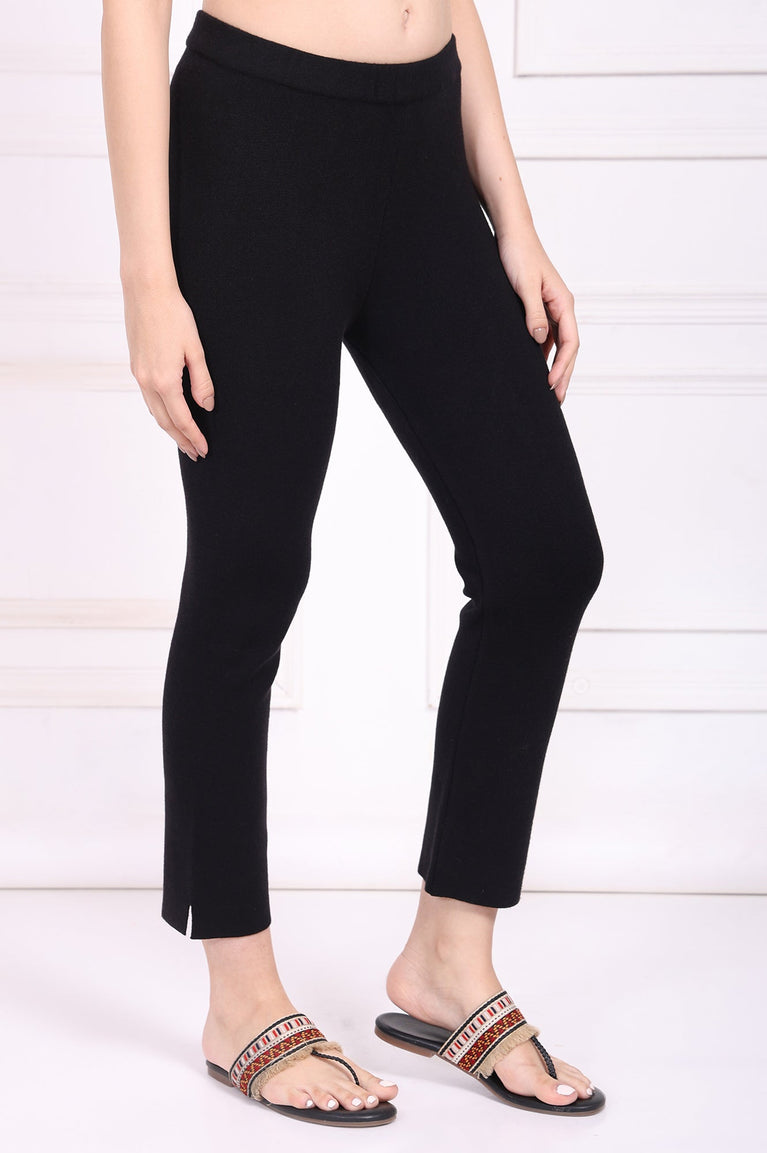 A masterpiece of minimalist design, these trousers for women are the answer to a flawlessly versatile wardrobe. Crafted to move with you, their design prioritizes both comfort and a polished aesthetic. As essential women's pants, they form the perfect canvas for weekday meetings or weekend brunches. The silhouette begins with a comfortable mid-rise, leading into a clean, flat front that ensures a smooth profile under any top. You’ll appreciate the ease of the fully elasticated waistband, making these black knit straight-leg pants a simple pull-on style without any fussy closures. The fit is impeccably tailored—a slim straight-leg cut that skims the body gracefully without feeling restrictive, offering a modern and elongated look. For an uncluttered finish, they are designed without any pockets. These ankle-length pants with slit detailing at the hem add a final touch of contemporary flair, allowing for beautiful movement and a peek of your favorite footwear. Woven from a fabric with a soft-to-the-touch feel and inherent flexibility, these ladies' trousers promise to be your most-worn pair, blending sophisticated structure with the ease of your favorite loungewear. They are the ultimate staple in refined, everyday dressing.