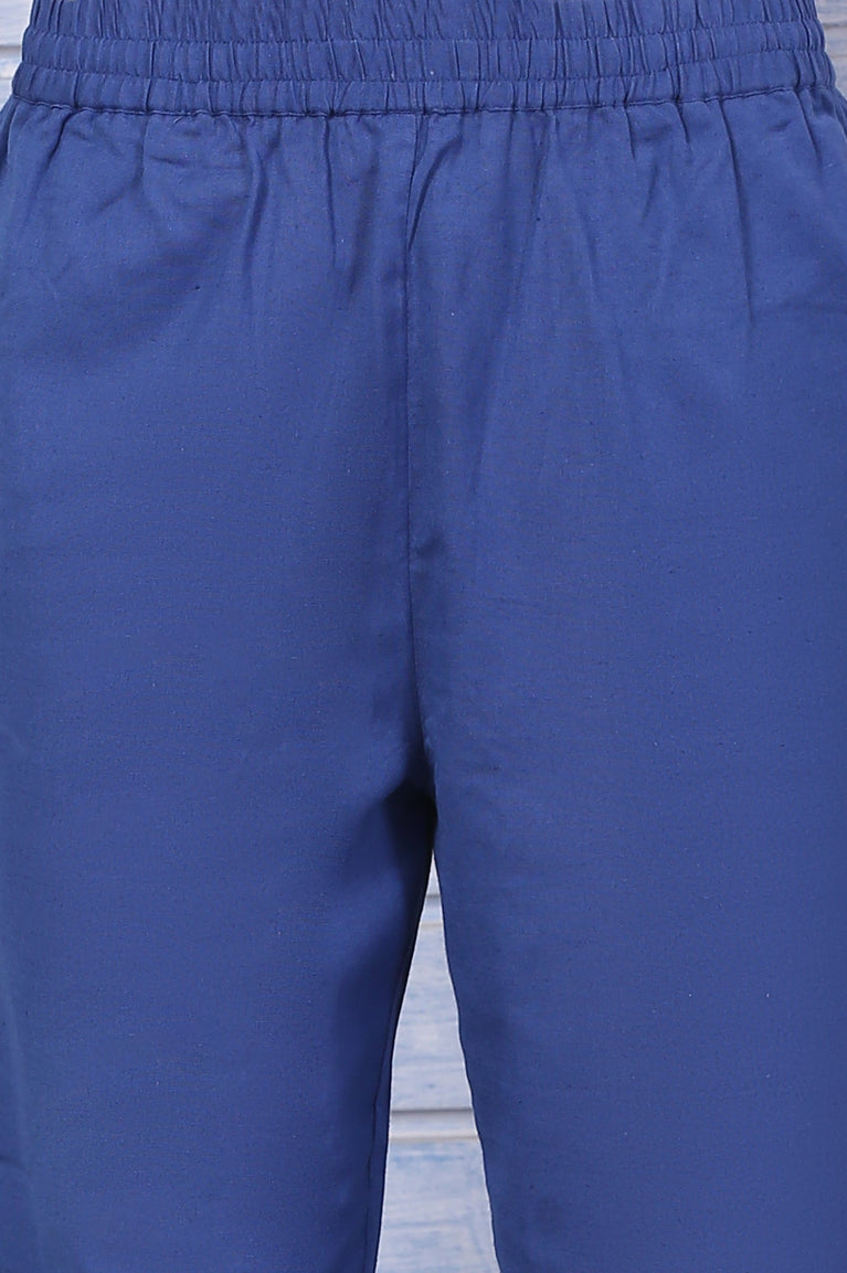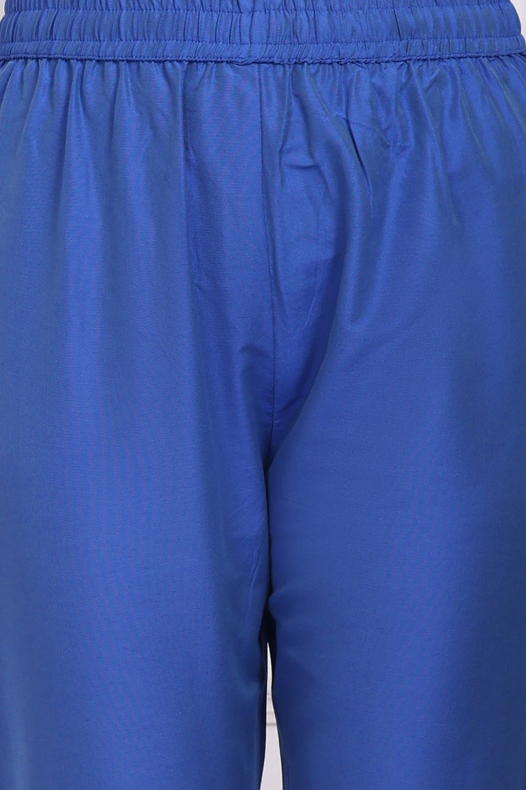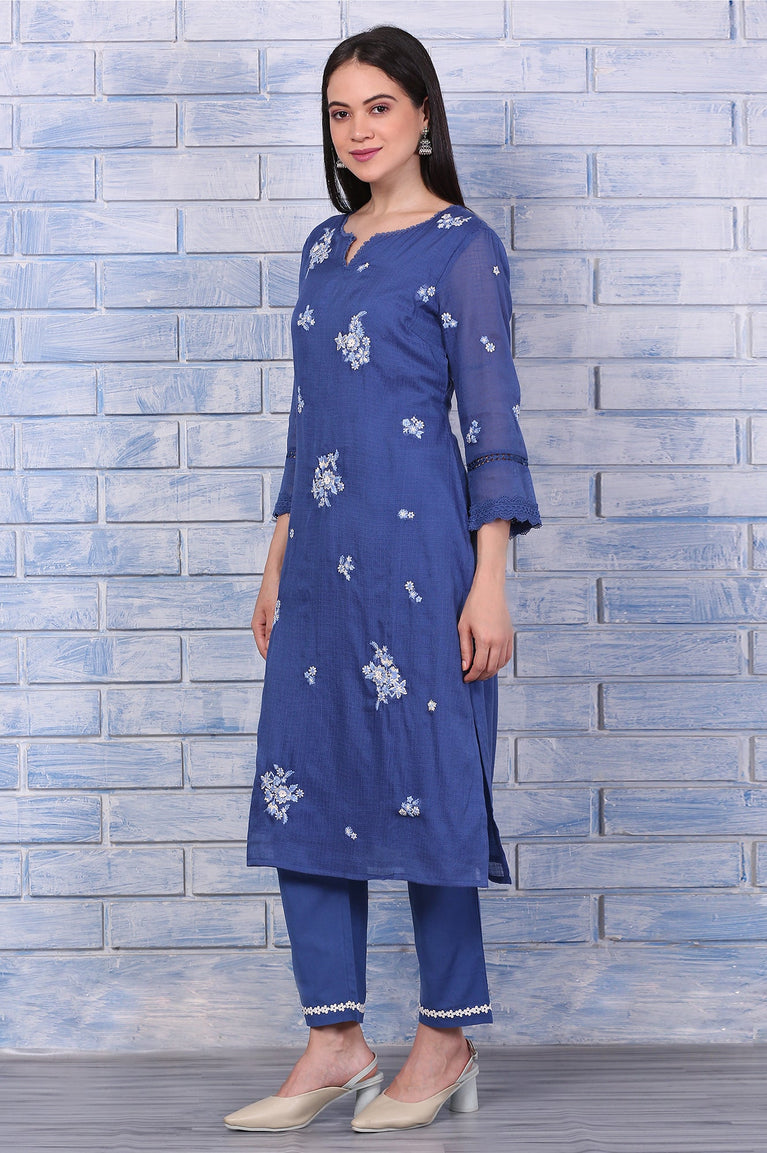 Blue Embroidered Kota Straight Kurta, Pants and Dupatta Set