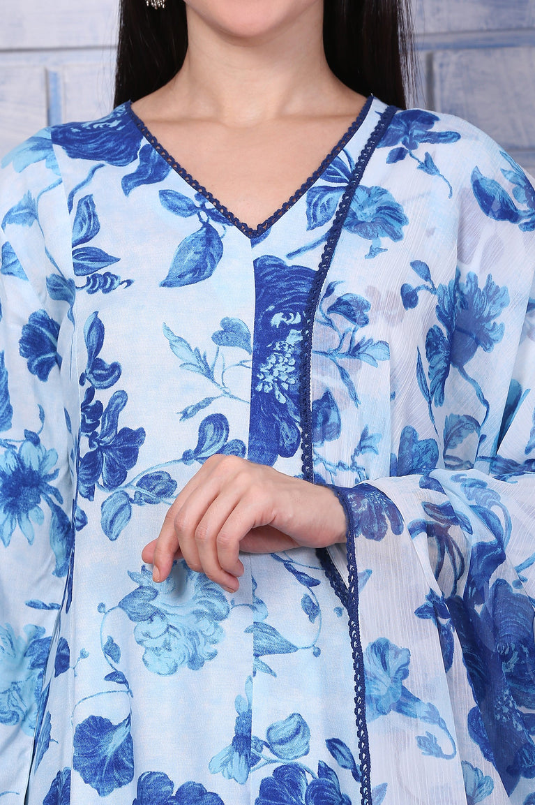 Blue Floral Printed Lace Flared Kurta, Pants and Dupatta Set