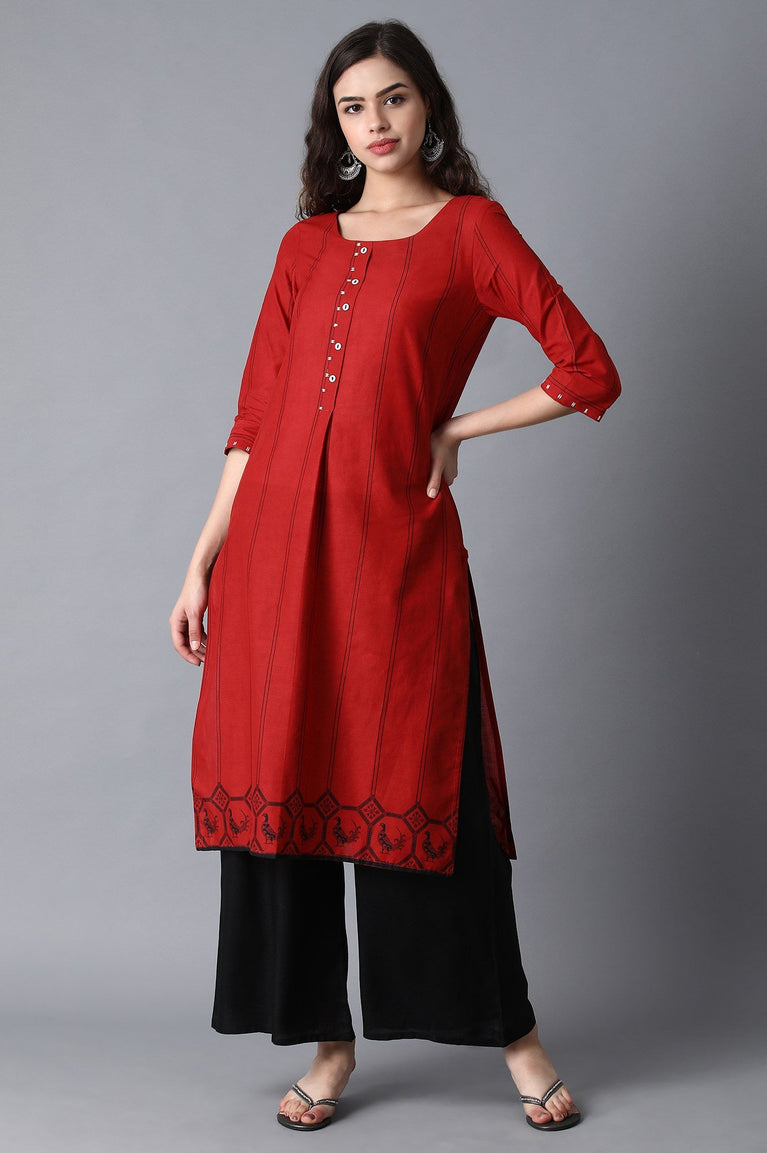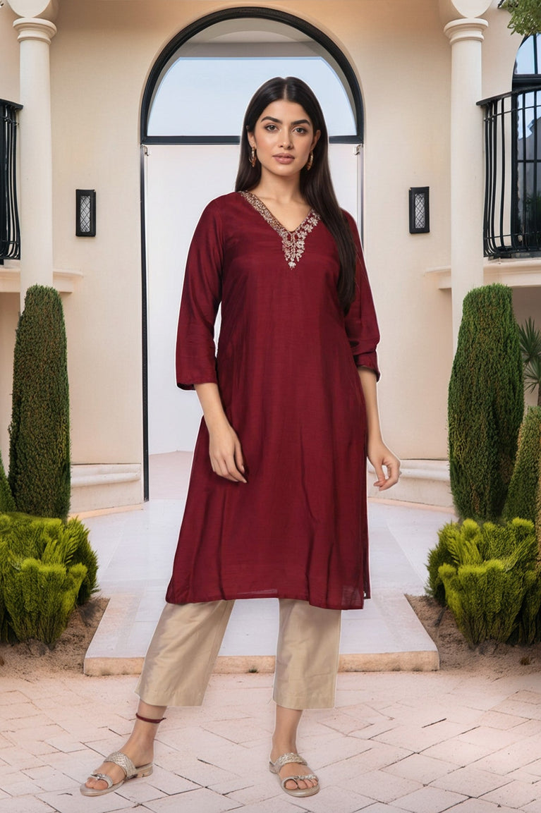 Here is the silhouette that flatters while it flows, a piece designed for the modern woman who cherishes timeless elegance. This beautiful kurta for women is presented in a sumptuous deep wine color, crafted from a material that catches the light with a subtle, rich sheen. The A-line shape glides effortlessly over the body, creating a silhouette that is both graceful and comfortable for long hours of celebration. All eyes will be drawn to the exquisite yoke, where intricate embroidery in contrasting tones frames the V-neckline, lending the piece an air of artisanal luxury. This ornamentation is the star, a perfect example of detailed craftsmanship. The kurta features elegant three-quarter sleeves and is fully opaque, ensuring complete comfort and confidence. Its straight hemline is punctuated with classic side slits, allowing for graceful movement. As a standalone piece, this festive tunic offers endless styling possibilities. It's the perfect choice for an evening soirée, a wedding reception, or any grand celebration on your calendar. Pair this party wear tunic with gilded accessories to complete your stunning look.