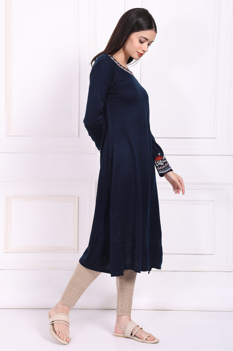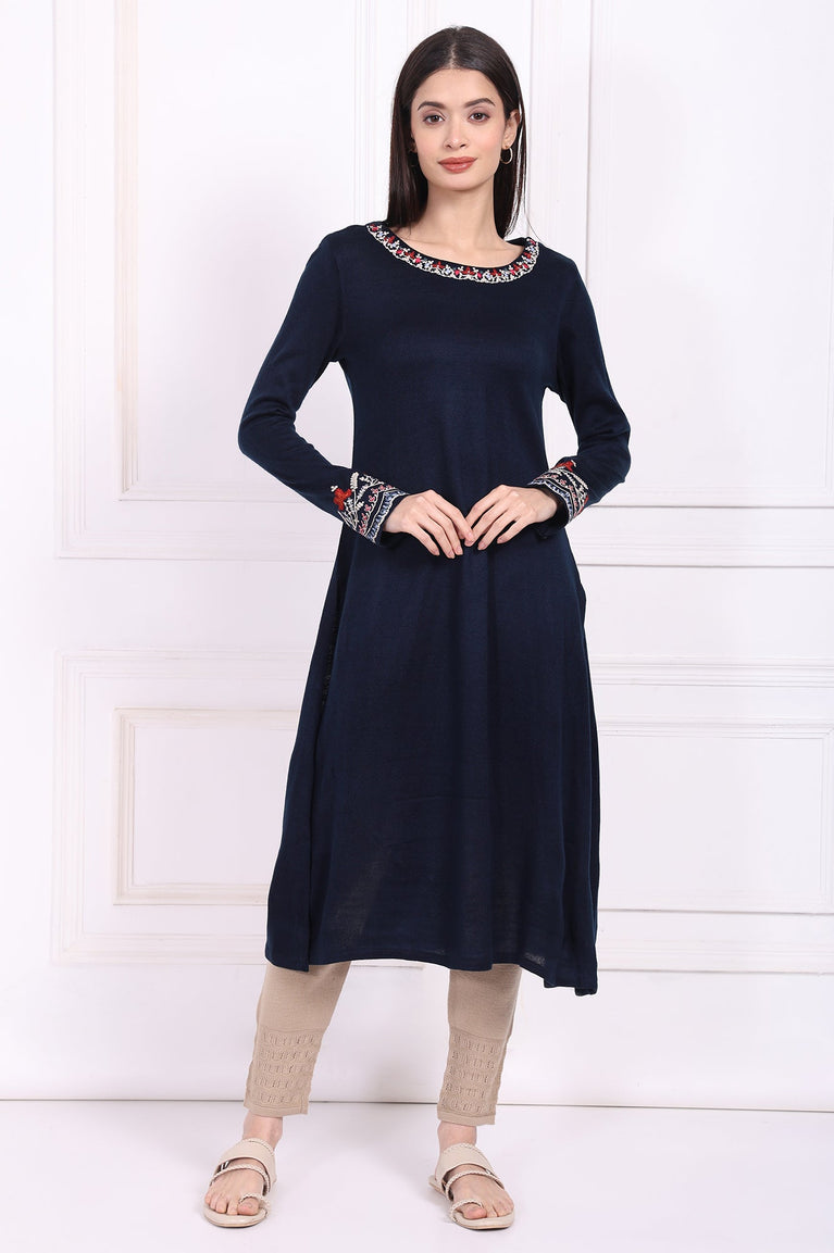 Navy Blue Embroidered A-Line Acrylic Winter Kurta