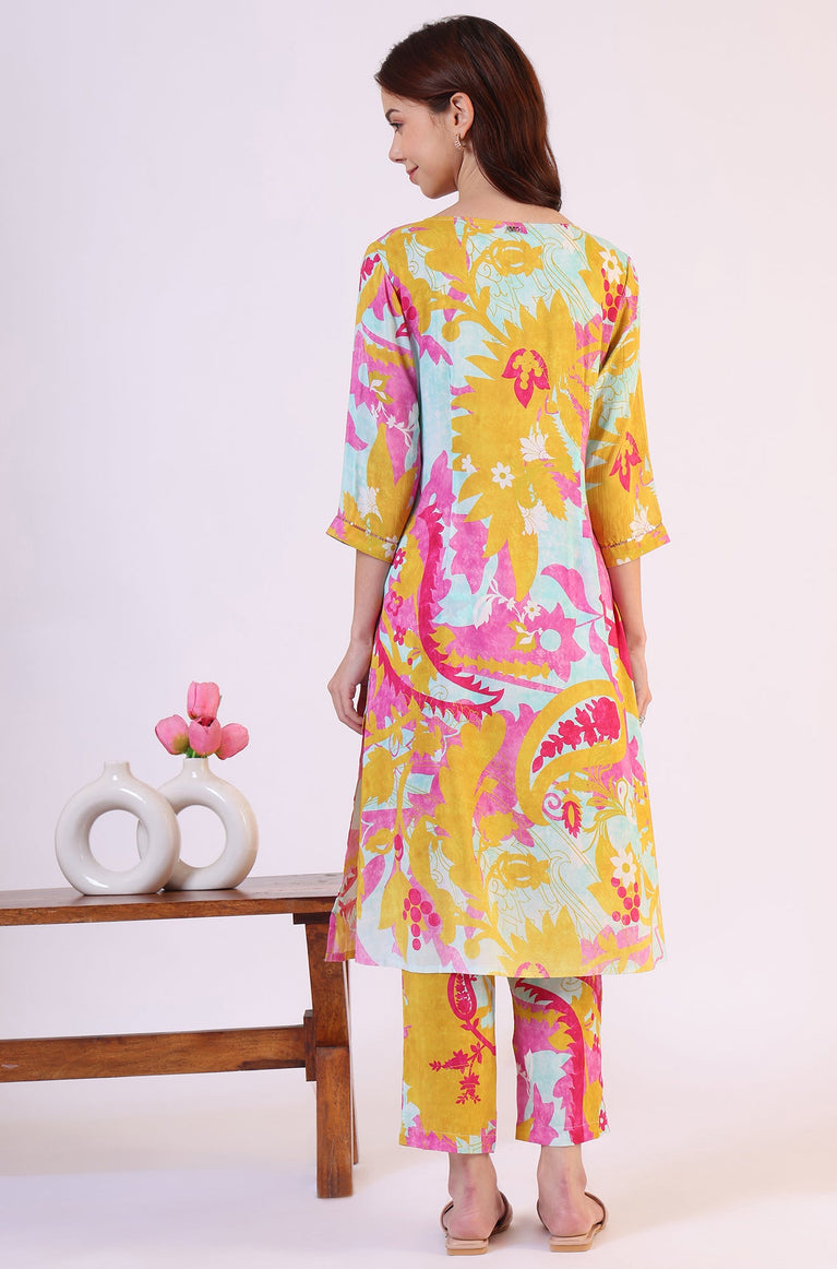 This elegant blue printed kurta set is crafted from luxurious modal satin, offering a smooth and flowy drape. The kurta features a flattering gathered silhouette that enhances movement and grace, making it a perfect blend of comfort and style. The round neckline adds a classic touch, while delicate sequin embellishments elevate the look with a subtle shimmer. Paired with matching printed straight pants, this ensemble strikes the perfect balance between tradition and contemporary charm. Ideal for festive gatherings, casual celebrations, or evening outings, this set exudes effortless sophistication.