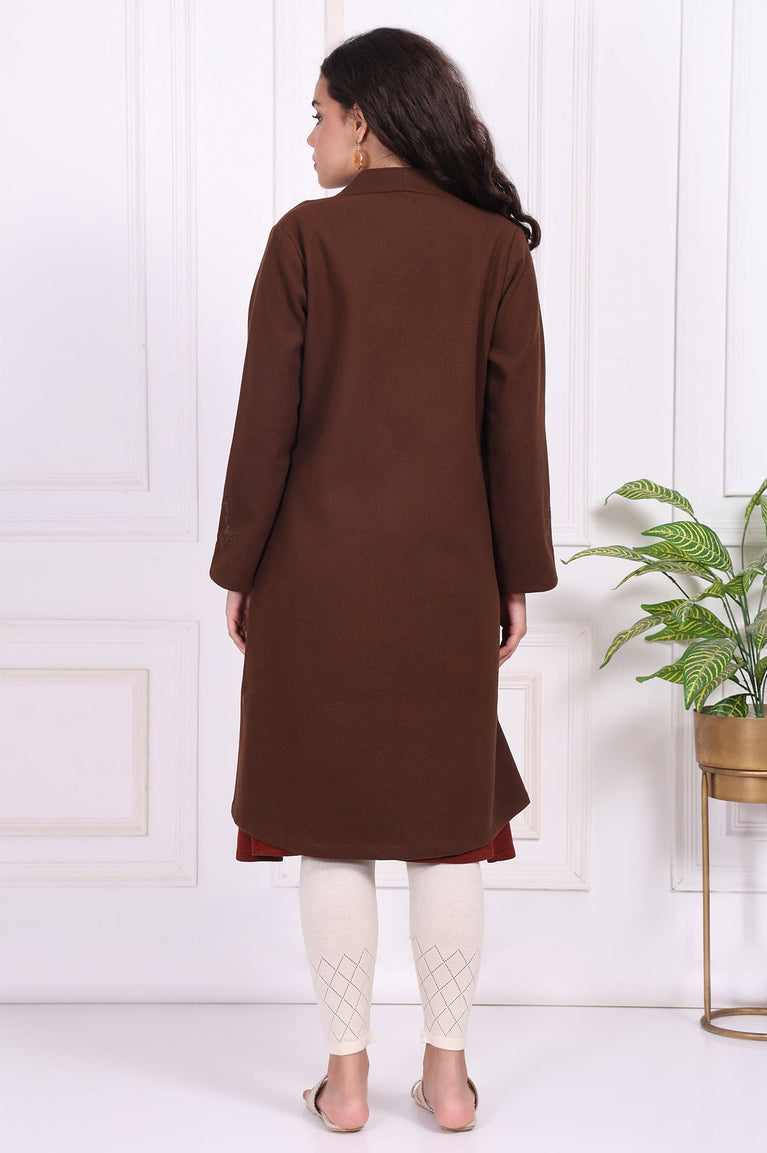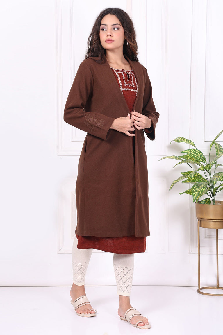 Chic and versatile, this brown solid straight coat for women is a winter wardrobe essential. The collarless design and embroidered sleeves add a touch of elegance, while the woven fabric ensures comfort and durability. Perfect for layering over ethnic or casual outfits, this longline coat is ideal for festive gatherings or casual outings. Its straight silhouette and dark brown shade make it a timeless addition to your collection. Whether you're dressing up for a special occasion or keeping it casual, this coat is your go-to choice for effortless sophistication.