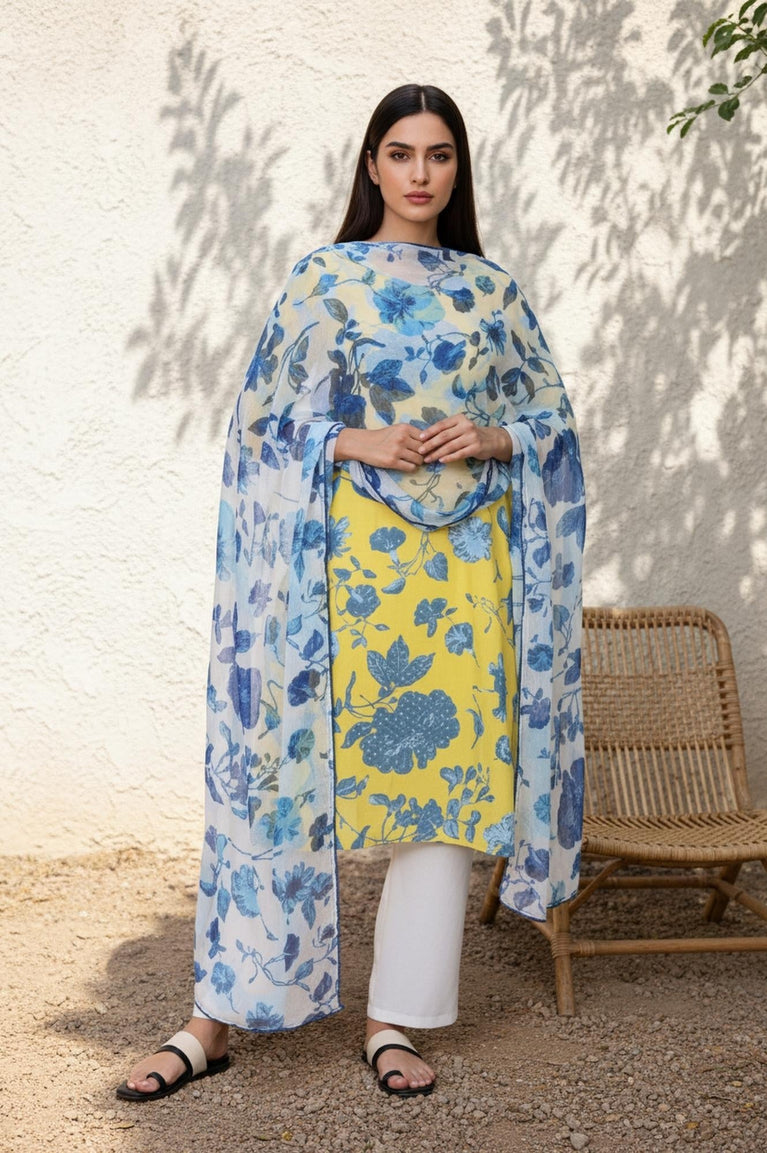 Make a vibrant yet graceful statement with this blue and yellow floral printed modern kurta set. Crafted in soft, breathable pure cotton, the kurta features an eye-catching bold floral print in rich blue tones, bringing freshness and energy to your ethnic collection. The flared silhouette adds a touch of femininity and flow, making it perfect for daytime celebrations or casual festive gatherings. Paired with comfortable straight-fit pants and a coordinated printed dupatta, the set balances traditional charm with everyday ease. Ideal for warm-weather events, this three-piece ensemble pairs beautifully with silver jewellery and sandals for a chic, effortless look.