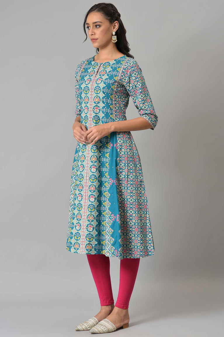 Blue Printed A-Line Kurta And Pants Set