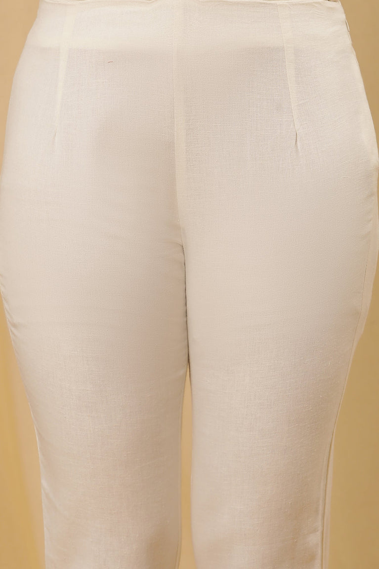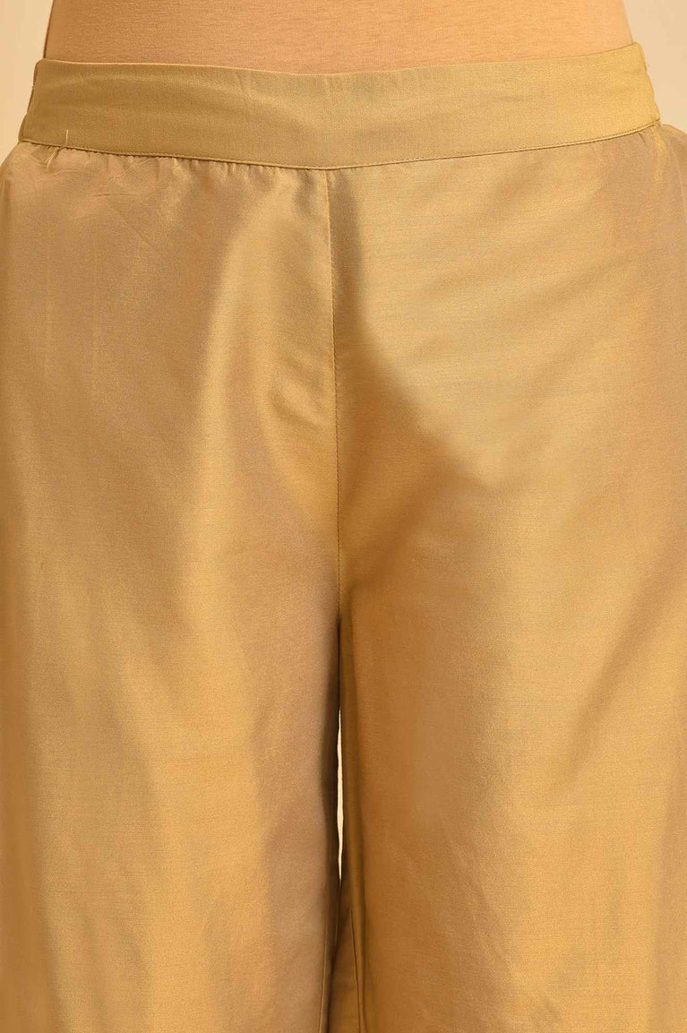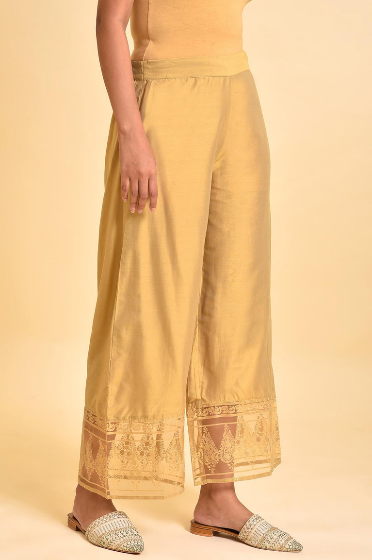 Velvet-soft elegance! These trousers for women sculpt a sleek mid-rise profile in Gold, accentuated by a wide-leg silhouette. A partially elasticated waistband ensures comfort, while the brasso panel on the hem adds a festive touch. Perfect for pairing with a matching kurta or drape, these pants are designed to elevate your ethnic wardrobe. Whether for festive occasions or casual outings, the gold floral print and woven fabric make this piece a versatile addition to your collection.