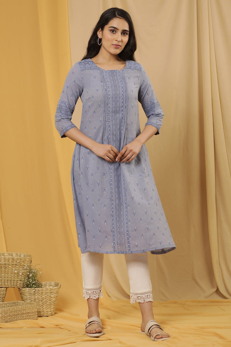 For The Casual Look Get This Blue Printed Kurta Set. The Set Has A-Line Kurta With Pleats On Yoke And Paired With Slim Pants.